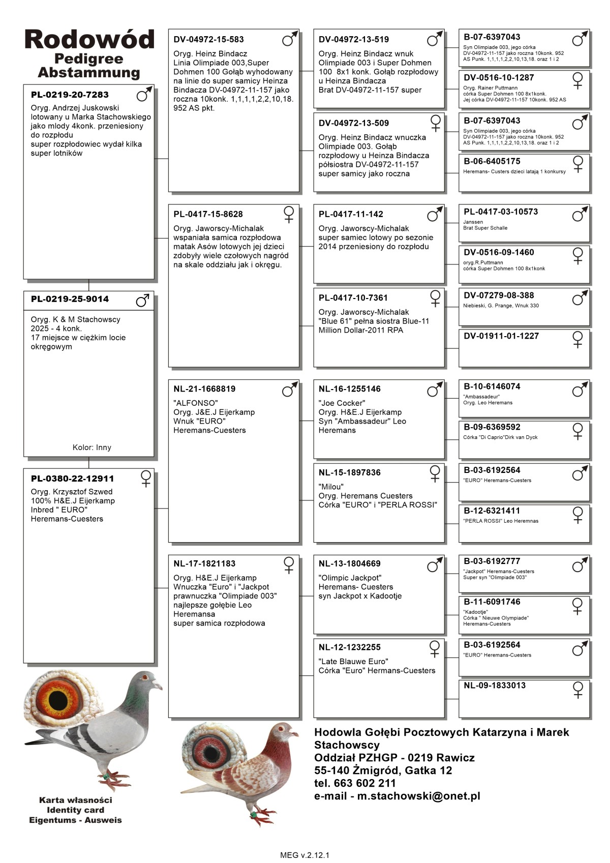 Oryg. K&M Stachowscy 2025 - 4 konk. Z gołębnika rozpłodowego Katarzyny i Marka Stachowskich - 2 Przodownika Polski w Kat. A - młode. Gołębie sprzedawane z powodu ograniczenia rozpłodu do minimum. Koszt transportu 150 zł po stronie kupującego