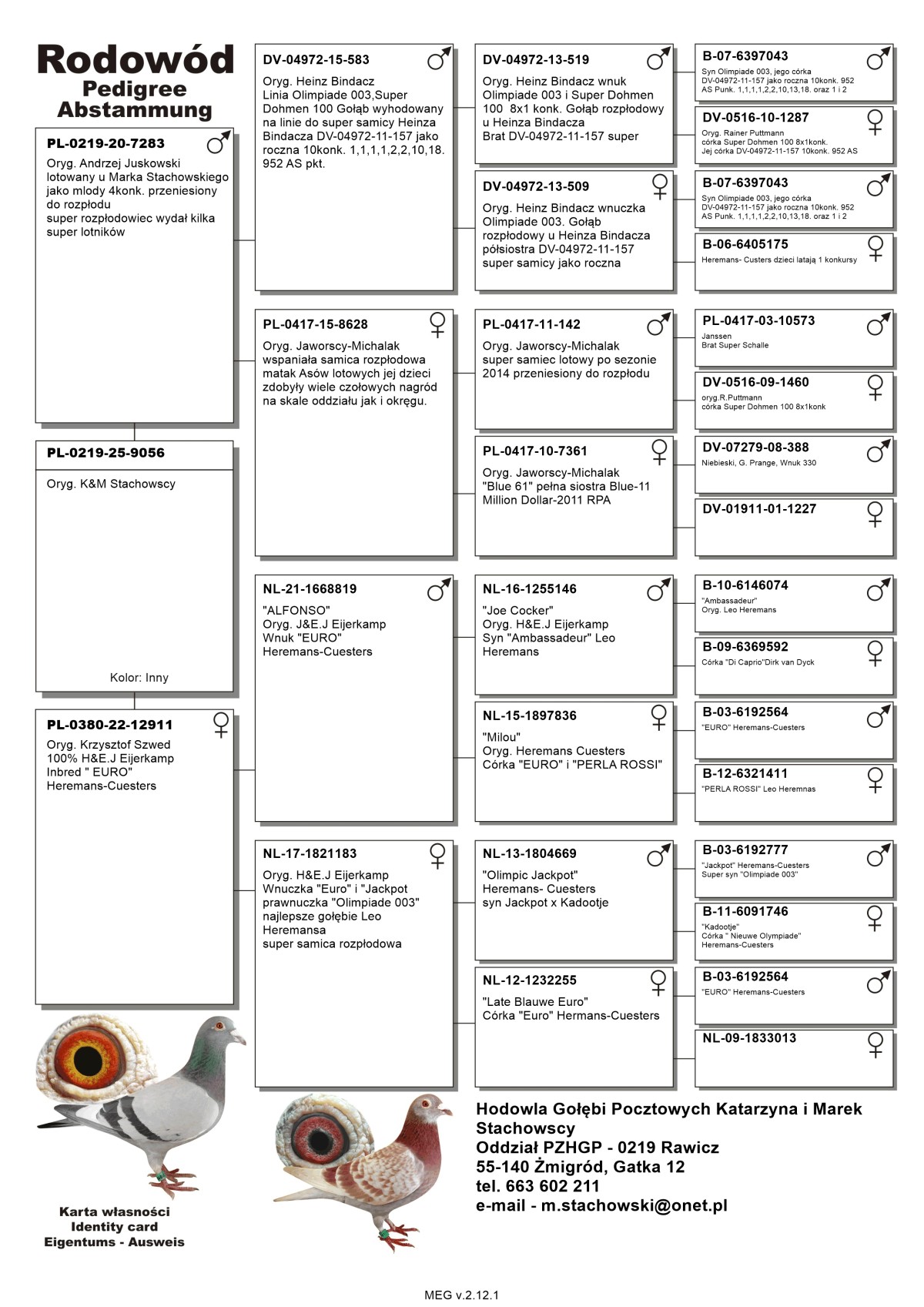 Oryg. K&M Stachowscy Z gołębnika rozpłodowego Katarzyny i Marka Stachowskich - 2 Przodownika Polski w Kat. A - młode. Gołębie sprzedawane z powodu ograniczenia rozpłodu do minimum. Koszt transportu 150 zł po stronie kupującego