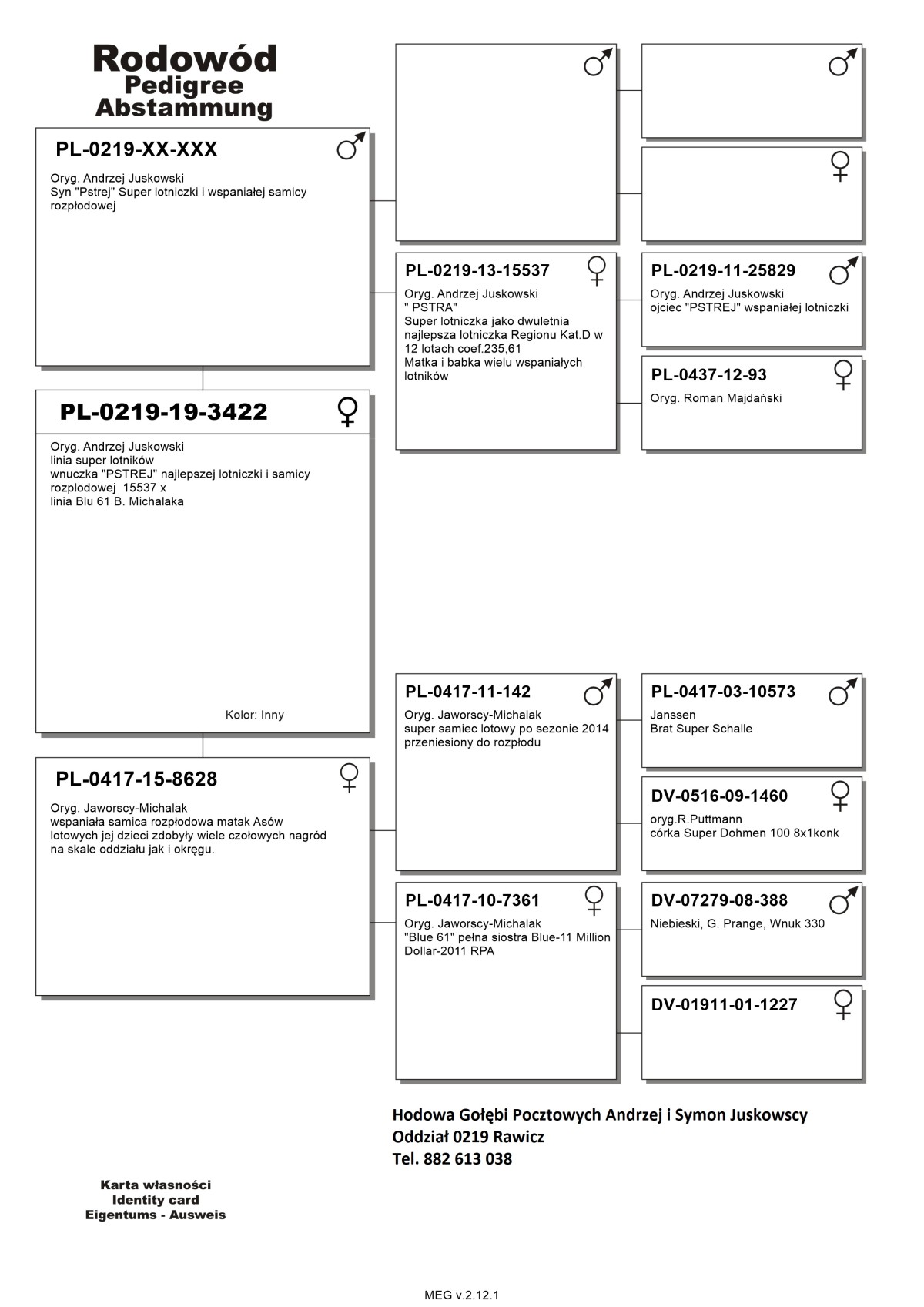 PL-0219-19-3422 - Oryg. Andrzej Juskowski siostra kilku super lotników, wnuczka PSTREJ 15537 najlepszej lotniczki i samicy rozpłodowej w hodowli x linia BLUE 61 B. Michalaka
