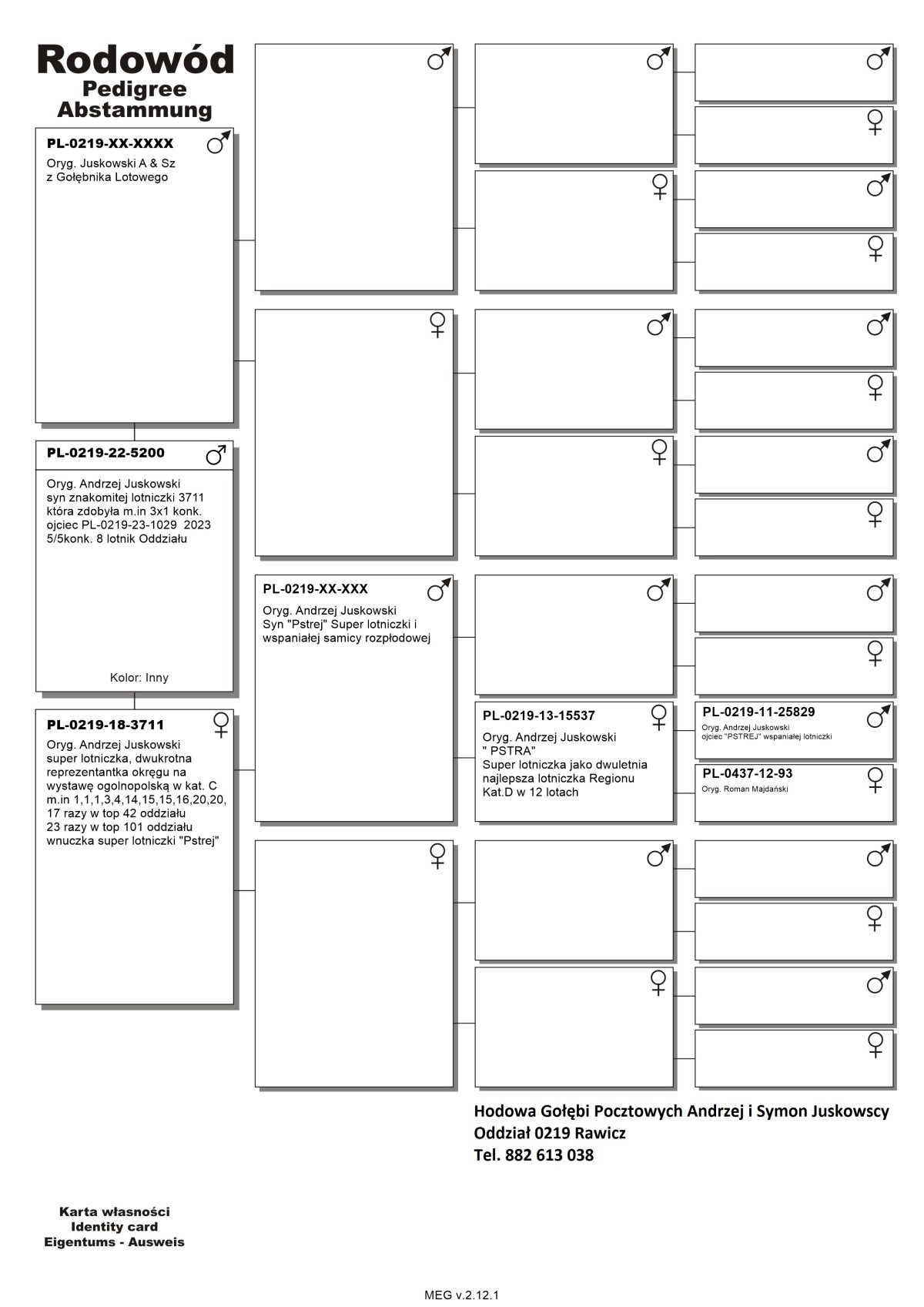 Oryg. Andrzej Juskowski z Gołębnika rozpłodowego Katarzyny i Marka Stachowskich - 2 Przodownika Polski w kat. A - młode. Gołębie sprzedawane z powodu ograniczenia rozpłodu do minimum. W Sezonie 2025