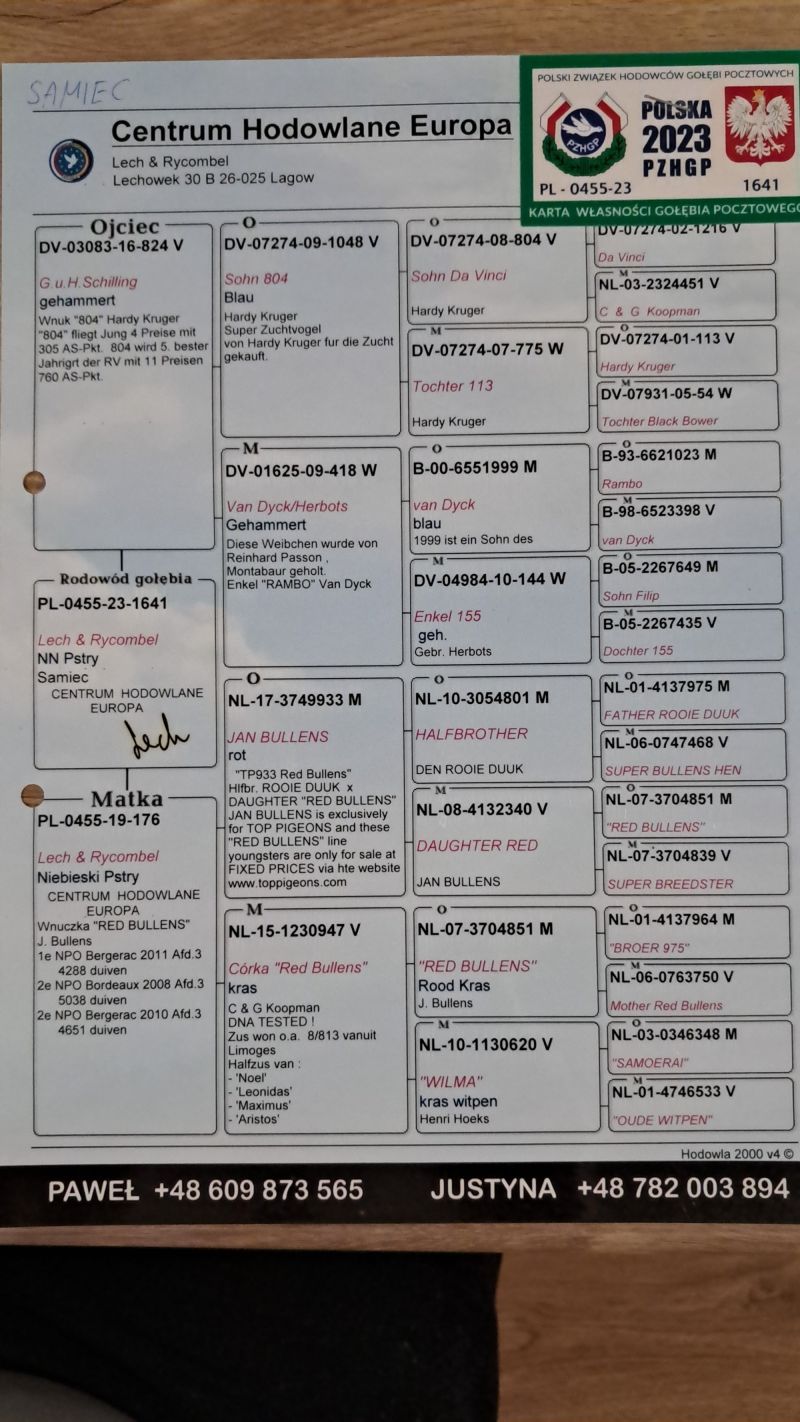 PL-0455-23-1641 oryg. Centrum Hodowlane Europa Wnuk "804 H.Kruger/ Linia "Rambo" D.Van Dyck x Wnuczka "Red Bullens"