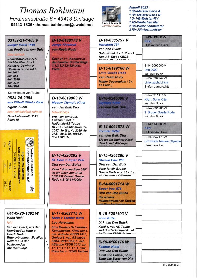 Oryginalny gołąb z hodowli Thomas Bahlmann. Szczegóły pochodzenia w rodowodzie. Więcej informacji pod nr tel.504780725