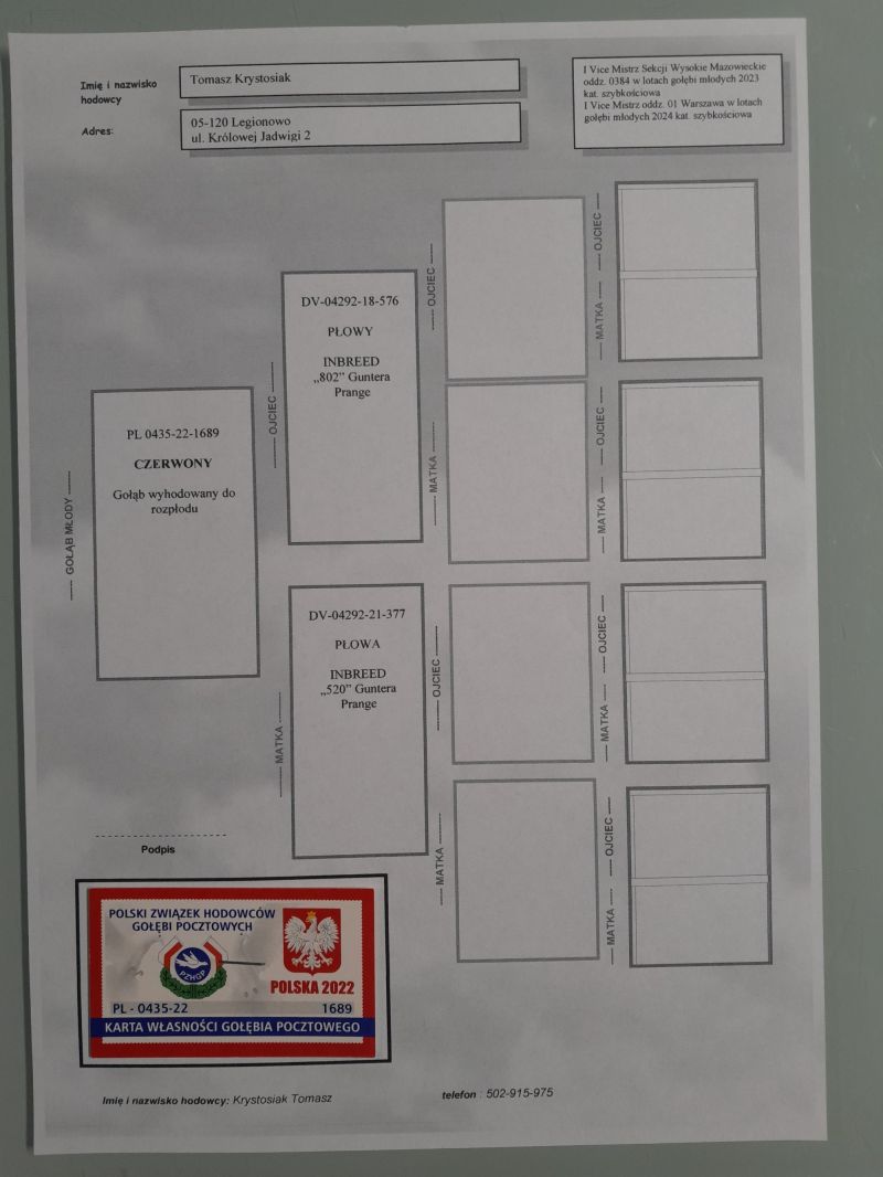 Samczyk wyhodowany do rozpłodu z dwóch zinbredowanych gołębi G. Knoppela. Więcej informacji o pochodzeniu i wynikach dzieci oraz rodzeństwa pod nr tel. 502-915-975.