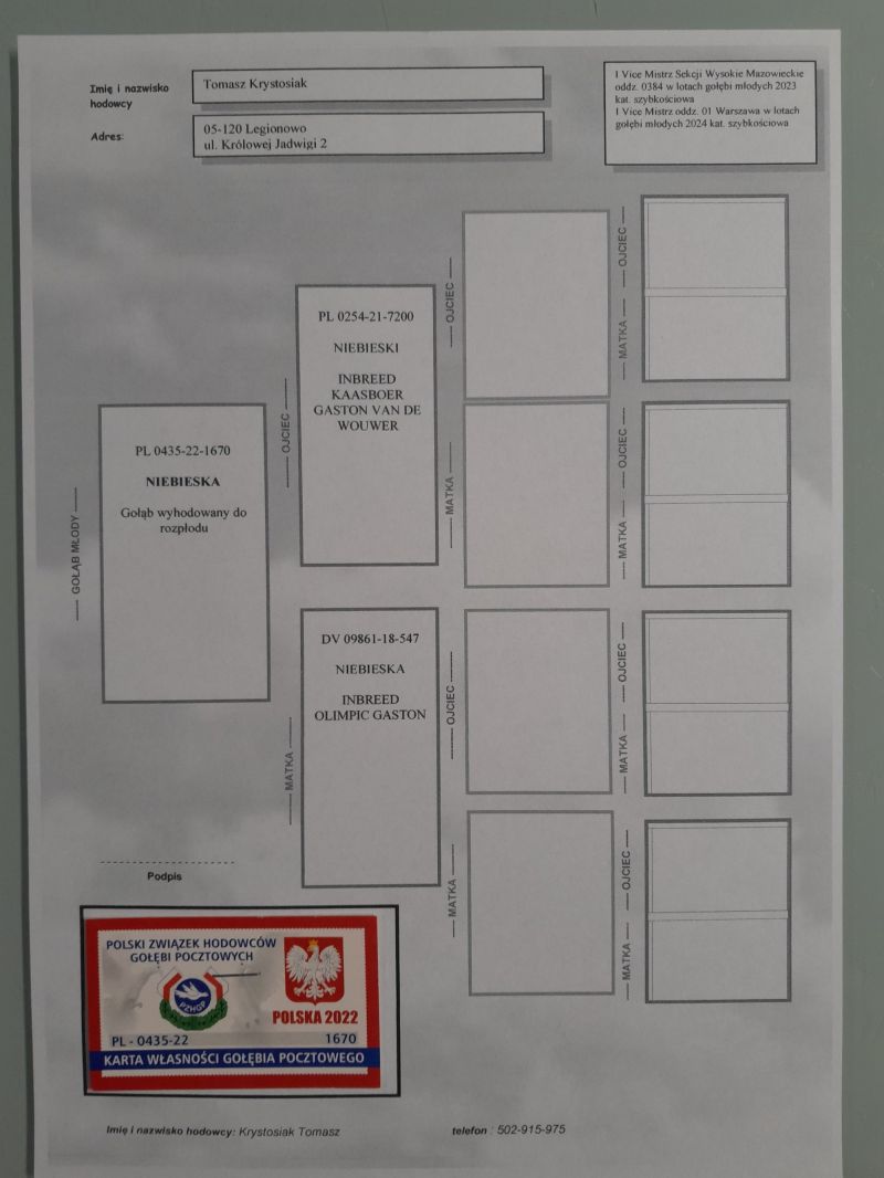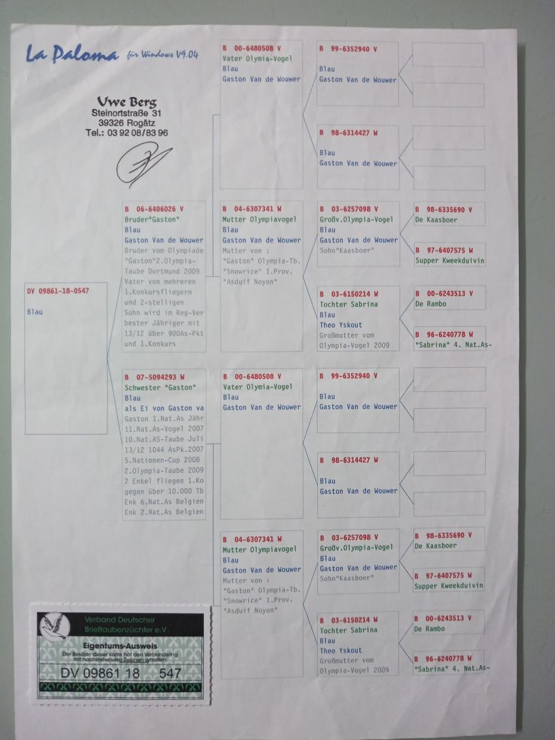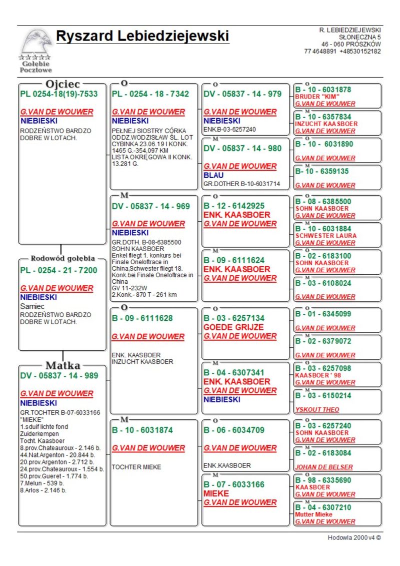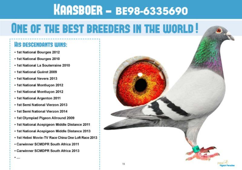 Samiczka wyhodowana do rozpłodu z dwóch gołębi będącymi potomkami słynnego KAASBOERa. Więcej informacji o pochodzeniu i wynikach rodzeństwa oraz potomstwa pod nr tel. 502-915-975.