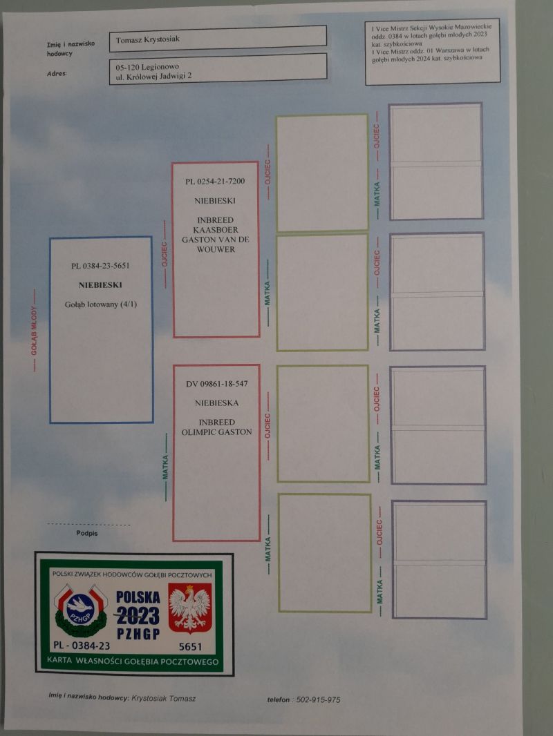 Samczyk wyhodowany do rozpłodu z dwóch gołębi będącymi potomkami słynnego KAASBOERa. Więcej informacji o pochodzeniu i wynikach rodzeństwa oraz potomstwa pod nr tel. 502-915-975.