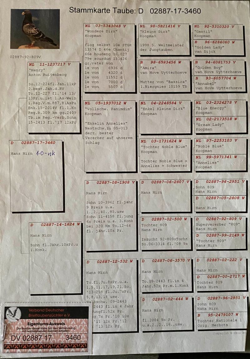 Oryginalny gołąb z hodowli Hans Hirn. Więcej informacji w rodowodzie oraz pod numerem telefonu: 502 785 086