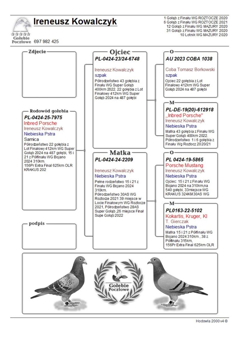 PL-0424-25-7975 - Inbred Porsche - oryg. I. Kowalczyk (11 gołębi)