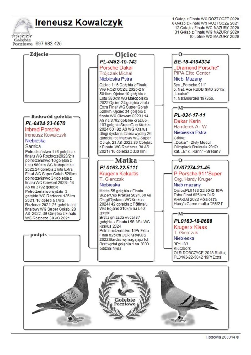 Gołąb z hodowli Ireneusz Kowalczyk. Informację o gołębiu dostępne w rodowodzie. Więcej informacji pod numerem telefonu: 697-982-425. Wysyłka po stronie kupującego