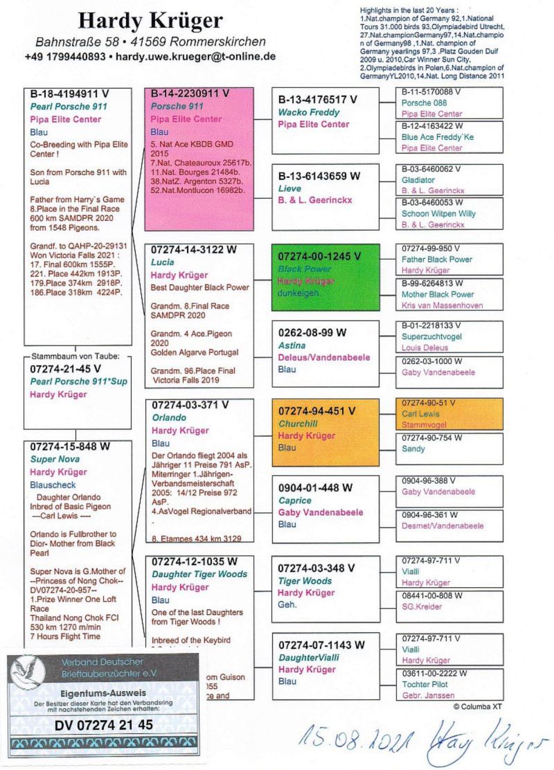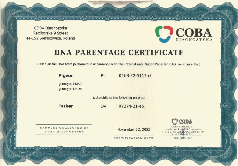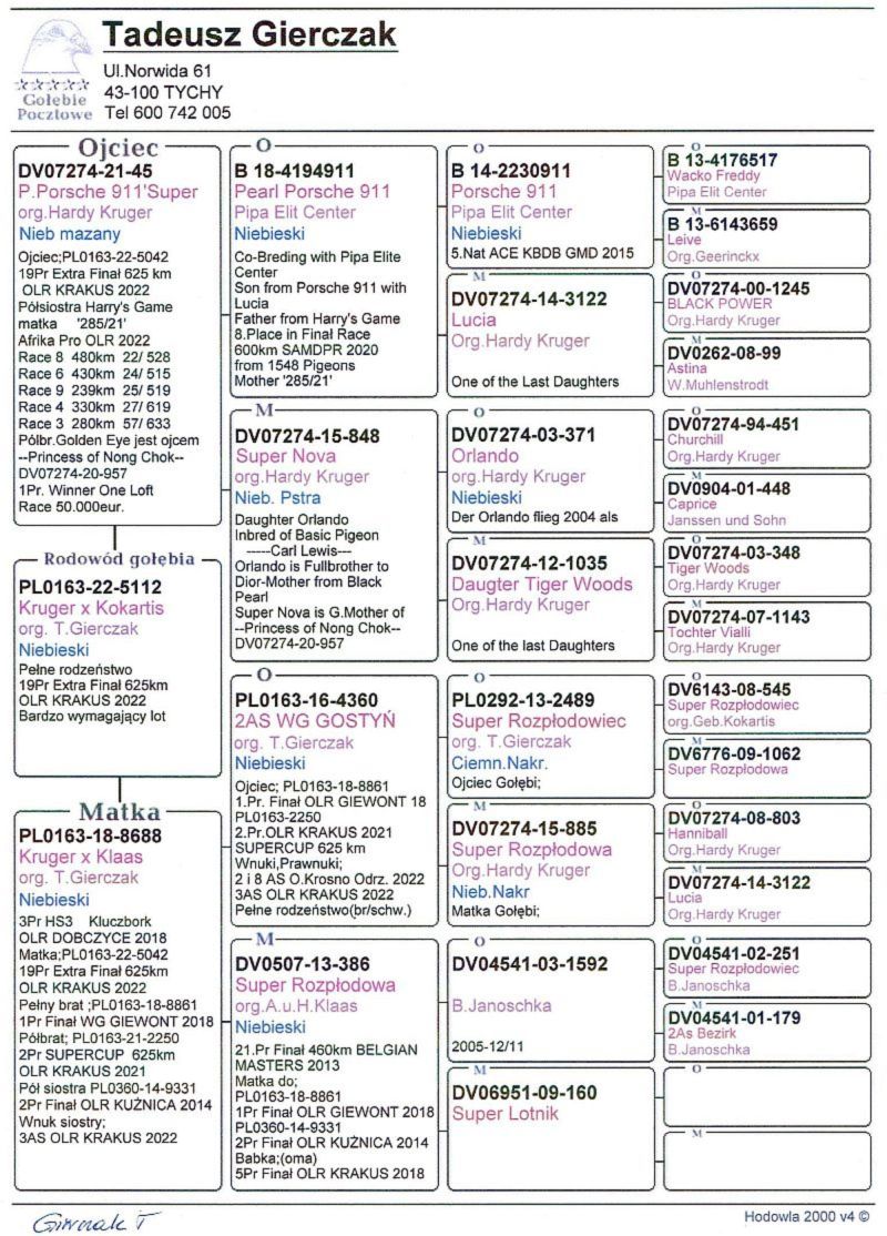 Gołąb z hodowli Ireneusz Kowalczyk. Informację o gołębiu dostępne w rodowodzie. Więcej informacji pod numerem telefonu: 697-982-425. Wysyłka po stronie kupującego