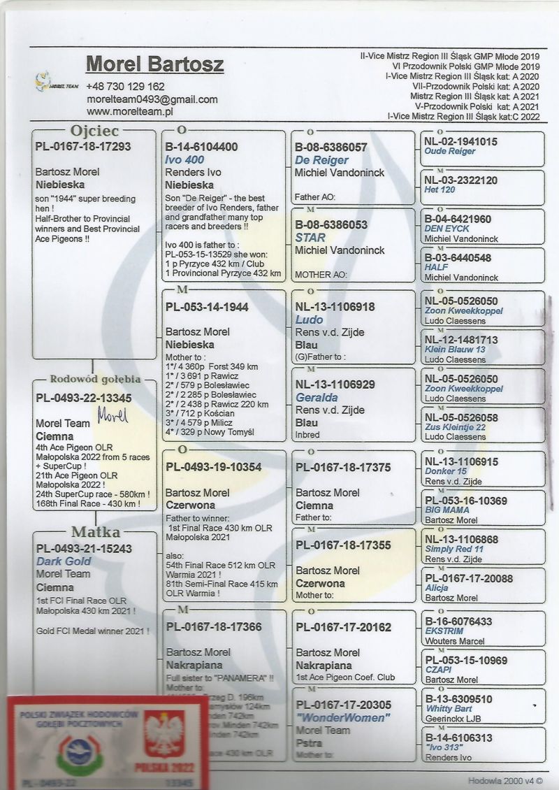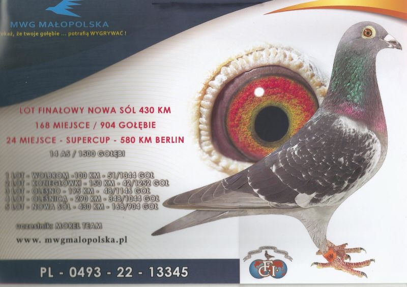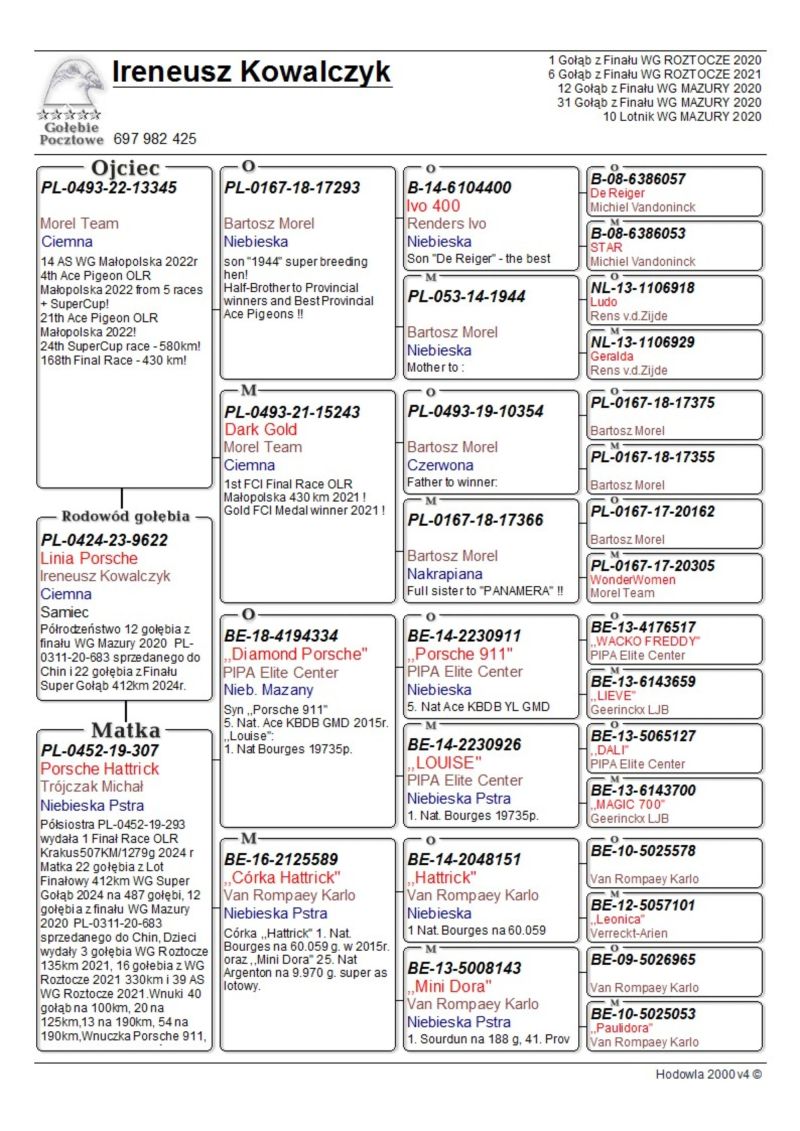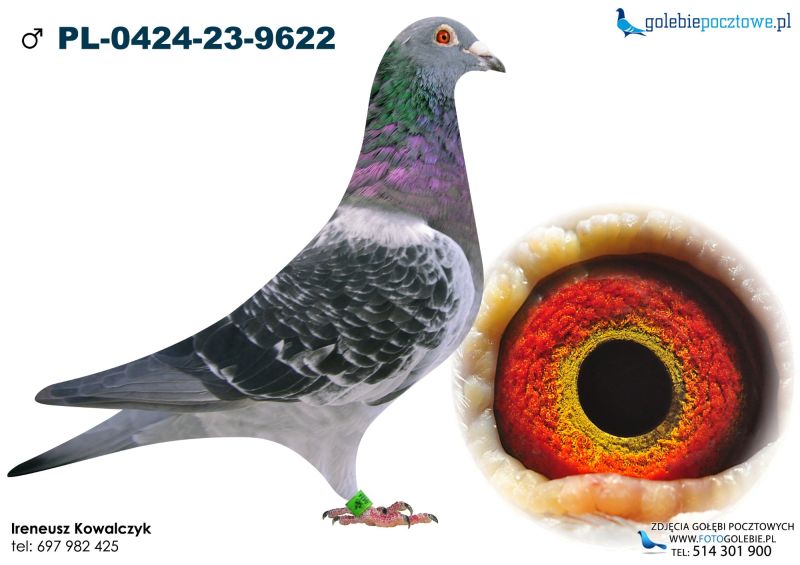 Gołąb z hodowli Ireneusz Kowalczyk. Informację o gołębiu dostępne w rodowodzie. Więcej informacji pod numerem telefonu: 697-982-425. Wysyłka po stronie kupującego
