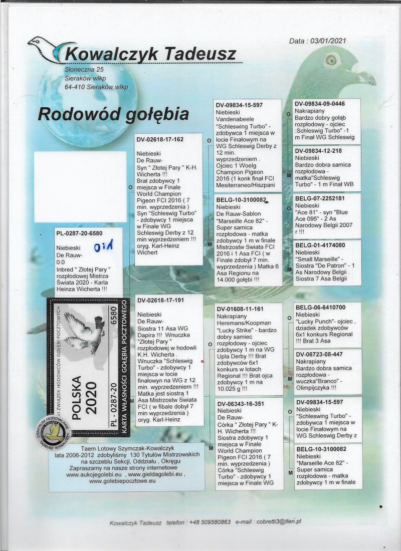 Z POWODU ZMIANY LOKALIZACJI GOŁĘBNIKA LIKWIDACJA GOŁĘBI RAZPŁODOWYCH.SAMICZKA T.KOWALCZYK LINIA INBRED ZŁOTEJ PARY MISTRZA ŚWIATA 2020 KARLA HEINZA WICHTERA LINIA SUPER LOTNIKÓW.MŁODE Z GOŁĘBNIKA ROZPŁODOWEGO WYWALCZYŁY W 2023/24/25 MISTRZ SEKCJI,W 2023 II PRZODOWNIK ODDZIAŁU,W 2024- I V-CE MISTRZ ODDZIAŁU,2025-I V-CE MISTRZ ODDZIAŁU.W 2024 II PRZODOWNIK OKRĘGU, 3 i 9 nagroda w kat F ZA STANDARTD NA WYSTAWIE OGÓLNOPOLSKIEJ.KOSZT WYSYŁKI POKRYWA KUPUJĄCY,PO WYGRANIU WPŁATA NA KONTO.POLECAM DO DALSZEJ HODOWLI