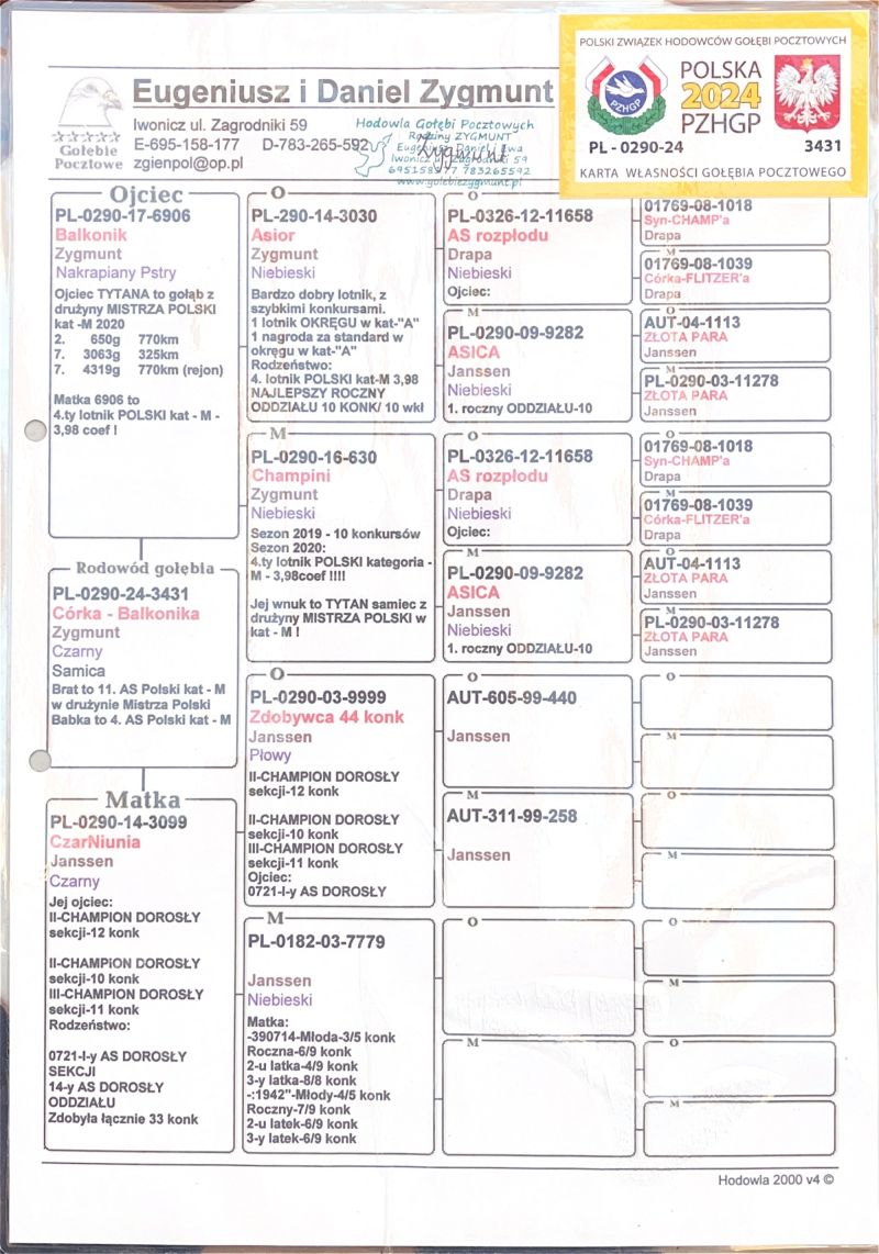 Oryginalny gołąb z hodowli Eugeniusz i Daniel Zygmunt. Więcej informacji w rodowodzie oraz pod numerem telefonu: 502 785 086