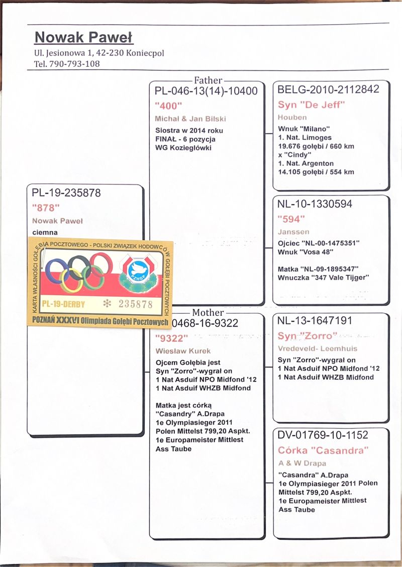 Oryginalny gołąb z hodowli Nowak Paweł. Więcej informacji w rodowodzie oraz pod numerem telefonu: 502 785 086