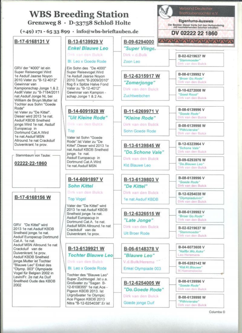Z POWODU ZMIANY LOKALIZACJI GOŁĘBNIKA LIKWIDACJA GOŁĘBI RAZPŁODOWYCH.SAMCZYN WBS BREEDING STATION LINIA KITTEL-BLAUWE LEO LINIA SUPER LOTNIKÓW.MŁODE Z GOŁĘBNIKA ROZPŁODOWEGO WYWALCZYŁY W 2023/24/25 MISTRZ SEKCJI,W 2023 II PRZODOWNIK ODDZIAŁU,W 2024- I V-CE MISTRZ ODDZIAŁU,2025-I V-CE MISTRZ ODDZIAŁU.W 2024 II PRZODOWNIK OKRĘGU, 3 i 9 nagroda w kat F ZA STANDARTD NA WYSTAWIE OGÓLNOPOLSKIEJ.KOSZT WYSYŁKI POKRYWA KUPUJĄCY,PO WYGRANIU WPŁATA NA KONTO.POLECAM DO DALSZEJ HODOWLI