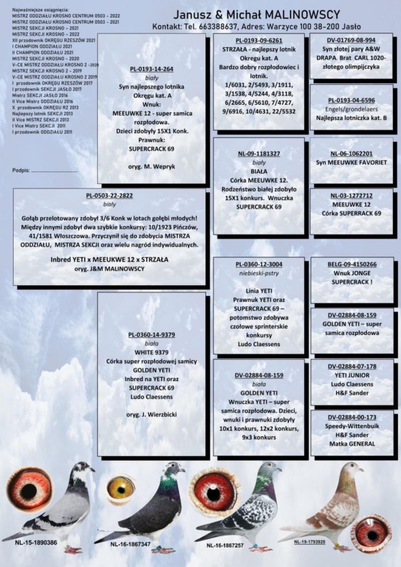 Z POWODU ZMIANY LOKALIZACJI GOŁĘBNIKA LIKWIDACJA GOŁĘBI RAZPŁODOWYCH.SAMICZKA MALINOWSKI LOTOWANA 6/3 KONK Z GOŁĘBI LUDO CLASENS LINIA MEWKE 12,YETI,DRAPA LINIA LINIA SUPER LOTNIKÓW.MŁODE Z GOŁĘBNIKA ROZPŁODOWEGO WYWALCZYŁY W 2023/24/25 MISTRZ SEKCJI,W 2023 II PRZODOWNIK ODDZIAŁU,W 2024- I V-CE MISTRZ ODDZIAŁU,2025-I V-CE MISTRZ ODDZIAŁU.W 2024 II PRZODOWNIK OKRĘGU, 3 i 9 nagroda w kat F ZA STANDARTD NA WYSTAWIE OGÓLNOPOLSKIEJ.KOSZT WYSYŁKI POKRYWA KUPUJĄCY,PO WYGRANIU WPŁATA NA KONTO.POLECAM DO DALSZEJ HODOWLI