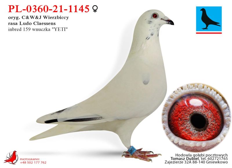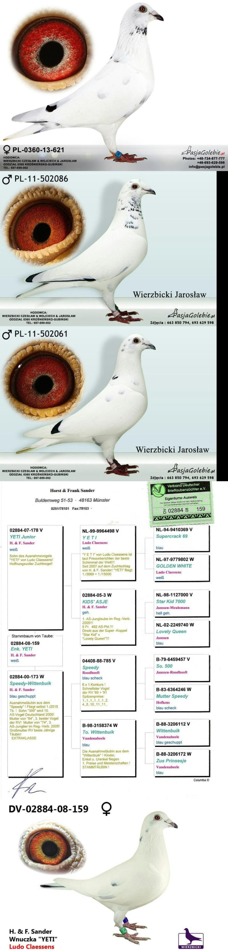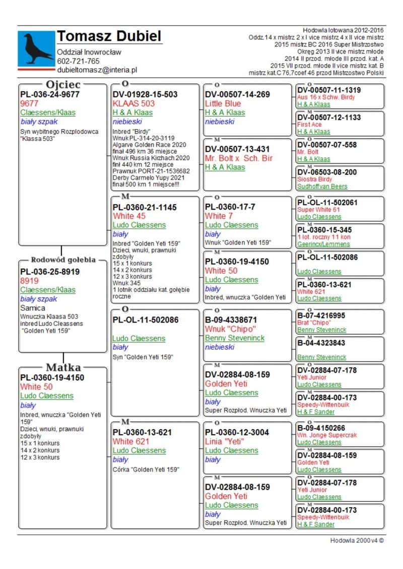 Samiczka z 2 lęgu. Białe od kolegi Jarka Wierzbickiego to piękne twarde gołębie. Super latają w domu i na WG. ****************************************** Moje stado opiera się na ptakach które w latach 2012-2016 pozwoliły mi wygrywać w oddziale i okręgu w różnych kategoriach, lecąc w 2 różnych oddziałach 036 i 0394. Najważniejsze osiągnięcia to Mistrz okręgu kat. C 49 miejsce w Polsce, II vice Mistrz okręgu kat. B i młode, Super Mistrz Oddziału. Wszystkie wyniki dokładnie opisane na końcu aukcji. Do lotowania wróciłem „na chwilę” w 2021 r. na nowym miejscu zamieszkania w bardzo ciężkim sezonie 3 x vice Mistrz Oddziału gołębi młodych. 2,5,11,16,19,22,23,27,28,40 pozycje w klasyfikacji lotników. 3 x Mistrz sekcji oraz XIII przodownika okręgu Bydgoszcz. Zacząłem też lotowanie na WG wysyłając po kilka sztuk na sezon. 2021 – konkursy na finałach na WG Krakus i Super Gołąb, 2022 - 14 miejsce Extra Finał 518 km WG Super Gołąb, 2023 – 11 miejsce Finał 502 km WG Bojano. 2024 - 4 miejsce Półfinał WG Tatry, WG Bojano 4 miejsce lot konkursowy, 34 miejsce Półfinał, 17 miejsce Drużyna, 54, 78, 79, 81 lotnik. Po moich gołębiach w 2024 ptaki wylatały: po pełnej parze 68 miejsce Finał Super Gołąb, po samcu 8 miejsce Extra Finał WG Warmia, po samicy 16 miejsce Finał WG Roztocze, po samcu 3 AS długi dystans i 7 miejsce Extra Finał MWG Giewont. 2025 31 lotnik Derby Carmelo Yupi, 43 miejsce Extra Finał WG Tatry, 12 miejsce Finał WG Carpatia, 40 miejsce Finał WG Krakus (56 seria na 849 hodowców 2/2 w konkursie z 3 wysłanych ptaków), po samicy ode mnie 24 miejsce Finał Corabia One Loft Race. ********************** Wszystkie gołębie przyjęły komplet szczepień(Pharmavac, salmovir + ospa). Więcej informacji w rodowodach, zapraszam też do kontaktu telefonicznego, mailowego bądź WhatsApp. ********************* TRANSPORT, ptaki zostaną dostarczone transportem prywatnym w połowie grudnia, cena 1-2 szt. 100 zł, 3-6 szt. 150 zł, 7 i więcej 200 zł. Koszty transportu płatne kierowcy, za gołębie kierowcy bądź na konto, jak wygodniej. Istnieje również możliwość wcześniejszej wysyłki kurierskiej w cenie 150 zł do 6 szt. Zapraszam również do odbioru osobistego.