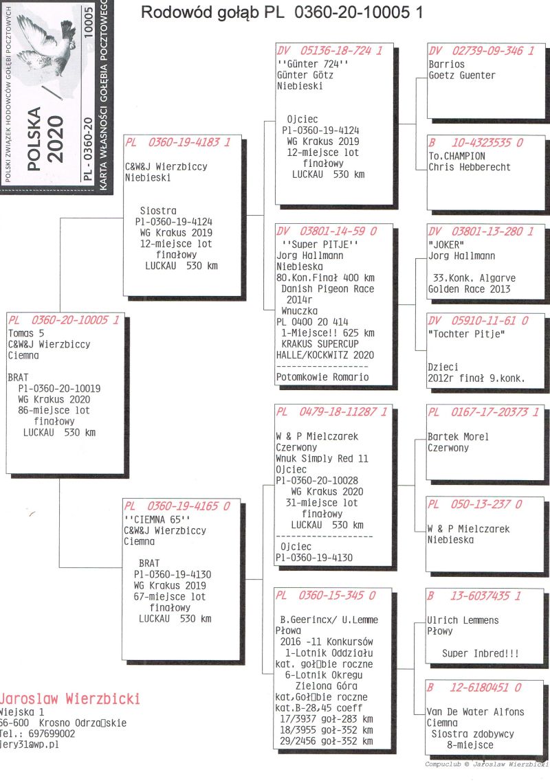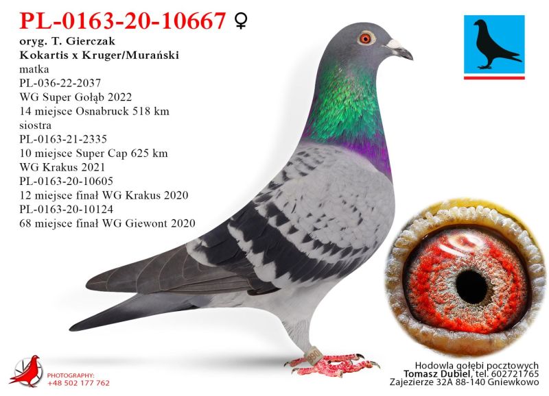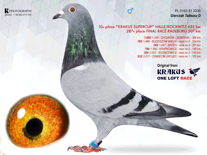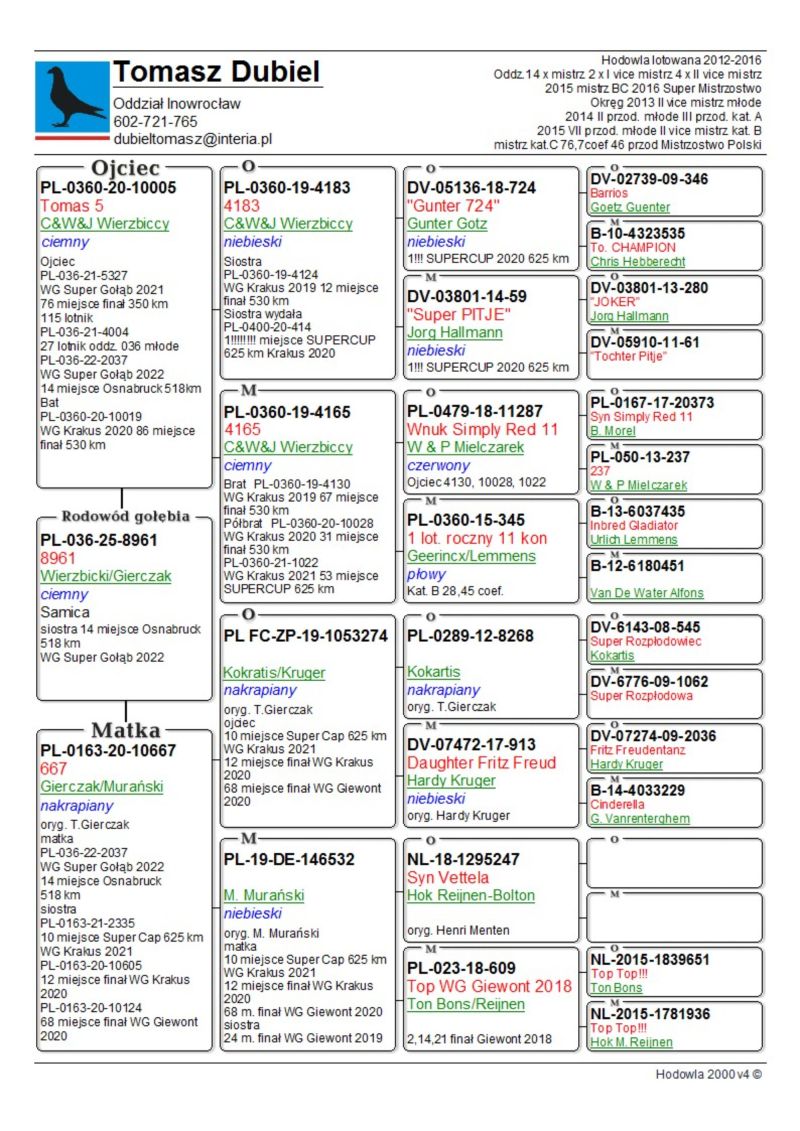 samica z 2 lęgu. ****************************************** Dzieci tej Pary sprawdzają się w lotach i rozpłodzie. Moje stado opiera się na ptakach które w latach 2012-2016 pozwoliły mi wygrywać w oddziale i okręgu w różnych kategoriach, lecąc w 2 różnych oddziałach 036 i 0394. Najważniejsze osiągnięcia to Mistrz okręgu kat. C 49 miejsce w Polsce, II vice Mistrz okręgu kat. B i młode, Super Mistrz Oddziału. Wszystkie wyniki dokładnie opisane na końcu aukcji. Do lotowania wróciłem „na chwilę” w 2021 r. na nowym miejscu zamieszkania w bardzo ciężkim sezonie 3 x vice Mistrz Oddziału gołębi młodych. 2,5,11,16,19,22,23,27,28,40 pozycje w klasyfikacji lotników. 3 x Mistrz sekcji oraz XIII przodownika okręgu Bydgoszcz. Zacząłem też lotowanie na WG wysyłając po kilka sztuk na sezon. 2021 – konkursy na finałach na WG Krakus i Super Gołąb, 2022 - 14 miejsce Extra Finał 518 km WG Super Gołąb, 2023 – 11 miejsce Finał 502 km WG Bojano. 2024 - 4 miejsce Półfinał WG Tatry, WG Bojano 4 miejsce lot konkursowy, 34 miejsce Półfinał, 17 miejsce Drużyna, 54, 78, 79, 81 lotnik. Po moich gołębiach w 2024 ptaki wylatały: po pełnej parze 68 miejsce Finał Super Gołąb, po samcu 8 miejsce Extra Finał WG Warmia, po samicy 16 miejsce Finał WG Roztocze, po samcu 3 AS długi dystans i 7 miejsce Extra Finał MWG Giewont. 2025 31 lotnik Derby Carmelo Yupi, 43 miejsce Extra Finał WG Tatry, 12 miejsce Finał WG Carpatia, 40 miejsce Finał WG Krakus (56 seria na 849 hodowców 2/2 w konkursie z 3 wysłanych ptaków), po samicy ode mnie 24 miejsce Finał Corabia One Loft Race. ********************** Wszystkie gołębie przyjęły komplet szczepień(Pharmavac, salmovir + ospa). Więcej informacji w rodowodach, zapraszam też do kontaktu telefonicznego, mailowego bądź WhatsApp. ********************* TRANSPORT, ptaki zostaną dostarczone transportem prywatnym w połowie grudnia, cena 1-2 szt. 100 zł, 3-6 szt. 150 zł, 7 i więcej 200 zł. Koszty transportu płatne kierowcy, za gołębie kierowcy bądź na konto, jak wygodniej. Istnieje również możliwość wcześniejszej wysyłki kurierskiej w cenie 150 zł do 6 szt. Zapraszam również do odbioru osobistego.