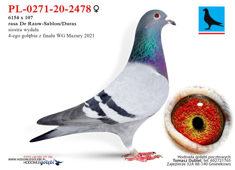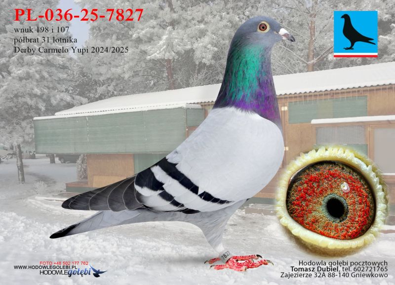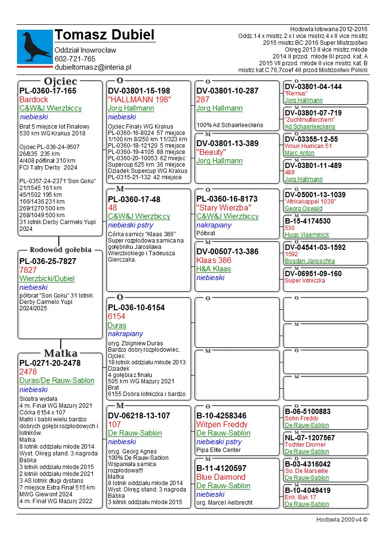 Prawdopodobnie samczyk. Rodzeństwo od stycznia będzie lotowane na Derby Carmelo Yupi w Hiszpani. Ojciec to syn 198 który jest tylko w tym roku przodkiem do 6080 1 asa długi dystans WG Carpatia, 6082 4 miejsce finał WG Carpatia, 6073 3 miejsce finał WG Super Gołąb. Ptaki z tej linii od razu pozwoliły mi fajnie bawić się na różnych wspólnych gołębnikach. Polecam. Matki siostra wydała 4 gołębia z finału WG Mazury 2021. Półbrat 3 ASA długi dystans i 7 miejsce Extra Finał MWG Giewont. ****************************************** Moje stado opiera się na ptakach które w latach 2012-2016 pozwoliły mi wygrywać w oddziale i okręgu w różnych kategoriach, lecąc w 2 różnych oddziałach 036 i 0394. Najważniejsze osiągnięcia to Mistrz okręgu kat. C 49 miejsce w Polsce, II vice Mistrz okręgu kat. B i młode, Super Mistrz Oddziału. Wszystkie wyniki dokładnie opisane na końcu aukcji. Do lotowania wróciłem „na chwilę” w 2021 r. na nowym miejscu zamieszkania w bardzo ciężkim sezonie 3 x vice Mistrz Oddziału gołębi młodych. 2,5,11,16,19,22,23,27,28,40 pozycje w klasyfikacji lotników. 3 x Mistrz sekcji oraz XIII przodownika okręgu Bydgoszcz. Zacząłem też lotowanie na WG wysyłając po kilka sztuk na sezon. 2021 – konkursy na finałach na WG Krakus i Super Gołąb, 2022 - 14 miejsce Extra Finał 518 km WG Super Gołąb, 2023 – 11 miejsce Finał 502 km WG Bojano. 2024 - 4 miejsce Półfinał WG Tatry, WG Bojano 4 miejsce lot konkursowy, 34 miejsce Półfinał, 17 miejsce Drużyna, 54, 78, 79, 81 lotnik. Po moich gołębiach w 2024 ptaki wylatały: po pełnej parze 68 miejsce Finał Super Gołąb, po samcu 8 miejsce Extra Finał WG Warmia, po samicy 16 miejsce Finał WG Roztocze, po samcu 3 AS długi dystans i 7 miejsce Extra Finał MWG Giewont. 2025 31 lotnik Derby Carmelo Yupi, 43 miejsce Extra Finał WG Tatry, 12 miejsce Finał WG Carpatia, 40 miejsce Finał WG Krakus (56 seria na 849 hodowców 2/2 w konkursie z 3 wysłanych ptaków), po samicy ode mnie 24 miejsce Finał Corabia One Loft Race. ********************** Wszystkie gołębie przyjęły komplet szczepień(Pharmavac, salmovir + ospa). Więcej informacji w rodowodach, zapraszam też do kontaktu telefonicznego, mailowego bądź WhatsApp. ********************* TRANSPORT, ptaki zostaną dostarczone transportem prywatnym na początku grudnia, cena 1-2 szt. 100 zł, 3-6 szt. 150 zł, 7 i więcej 200 zł. Koszty transportu płatne kierowcy, za gołębie kierowcy bądź na konto, jak wygodniej. Istnieje również możliwość wcześniejszej wysyłki kurierskiej w cenie 150 zł do 6 szt. Zapraszam również do odbioru osobistego.