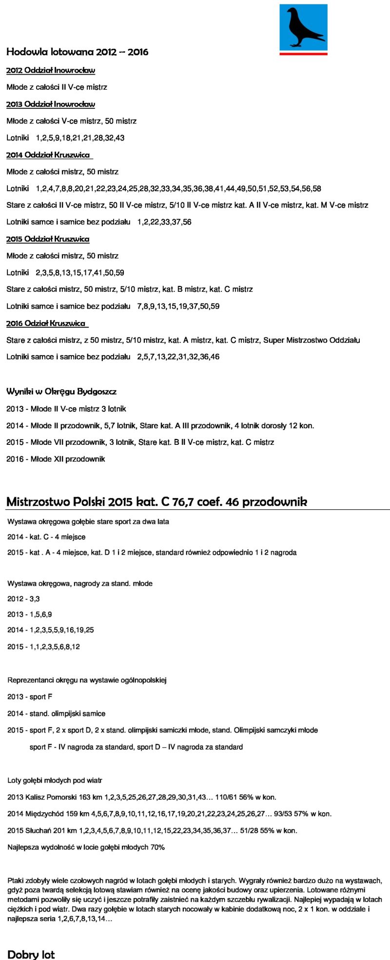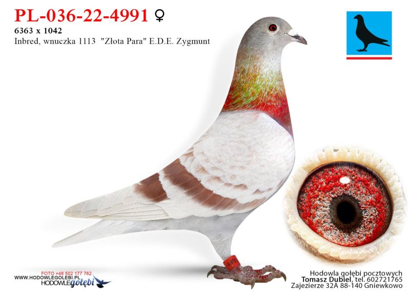 Prawdopodobnie Samiec. Córka "Złotej Pary" E.D.E. Zygmunt w połączeniu z super samcem od Damiana Szewca z linii olimpijki kat. C „Pocahontas” Jefa Vanwilkel dały mi wybitne lotniki i gołębie rozpłodowe. Ptaki te zdobyły u mnie wiele czołowych nagród w lotach w różnych kategoriach, oraz na wystawach. Samiczka z „moich Zygmuntów” jest babką 1 lotnika oddziału 2024 i 5 lotnika oddziału 2023 u rodziny Zygmunt. W 2025 samczyk z tych gołębi wydał 12 gołębia z finału na WG Carpati. ****************************************** Moje stado opiera się na ptakach które w latach 2012-2016 pozwoliły mi wygrywać w oddziale i okręgu w różnych kategoriach, lecąc w 2 różnych oddziałach 036 i 0394. Najważniejsze osiągnięcia to Mistrz okręgu kat. C 49 miejsce w Polsce, II vice Mistrz okręgu kat. B i młode, Super Mistrz Oddziału. Wszystkie wyniki dokładnie opisane na końcu aukcji. Do lotowania wróciłem „na chwilę” w 2021 r. na nowym miejscu zamieszkania w bardzo ciężkim sezonie 3 x vice Mistrz Oddziału gołębi młodych. 2,5,11,16,19,22,23,27,28,40 pozycje w klasyfikacji lotników. 3 x Mistrz sekcji oraz XIII przodownika okręgu Bydgoszcz. Zacząłem też lotowanie na WG wysyłając po kilka sztuk na sezon. 2021 – konkursy na finałach na WG Krakus i Super Gołąb, 2022 - 14 miejsce Extra Finał 518 km WG Super Gołąb, 2023 – 11 miejsce Finał 502 km WG Bojano. 2024 - 4 miejsce Półfinał WG Tatry, WG Bojano 4 miejsce lot konkursowy, 34 miejsce Półfinał, 17 miejsce Drużyna, 54, 78, 79, 81 lotnik. Po moich gołębiach w 2024 ptaki wylatały: po pełnej parze 68 miejsce Finał Super Gołąb, po samcu 8 miejsce Extra Finał WG Warmia, po samicy 16 miejsce Finał WG Roztocze, po samcu 3 AS długi dystans i 7 miejsce Extra Finał MWG Giewont. 2025 31 lotnik Derby Carmelo Yupi, 43 miejsce Extra Finał WG Tatry, 12 miejsce Finał WG Carpatia, 40 miejsce Finał WG Krakus (56 seria na 849 hodowców 2/2 w konkursie z 3 wysłanych ptaków), po samicy ode mnie 24 miejsce Finał Corabia One Loft Race. ********************** Wszystkie gołębie przyjęły komplet szczepień(Pharmavac, salmovir + ospa). Więcej informacji w rodowodach, zapraszam też do kontaktu telefonicznego, mailowego bądź WhatsApp. ********************* TRANSPORT, ptaki zostaną dostarczone transportem prywatnym w połowie grudnia, cena 1-2 szt. 100 zł, 3-6 szt. 150 zł, 7 i więcej 200 zł. Koszty transportu płatne kierowcy, za gołębie kierowcy bądź na konto, jak wygodniej. Istnieje również możliwość wcześniejszej wysyłki kurierskiej w cenie 150 zł do 6 szt. Zapraszam również do odbioru osobistego.