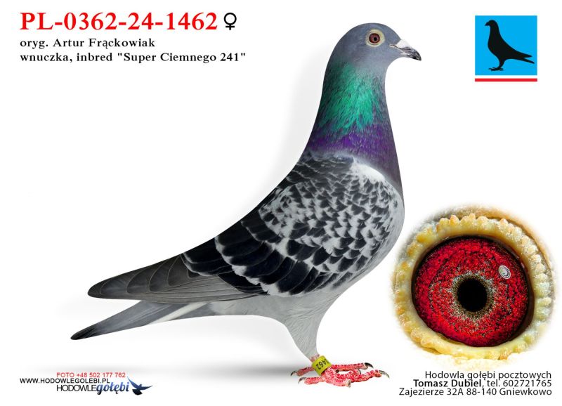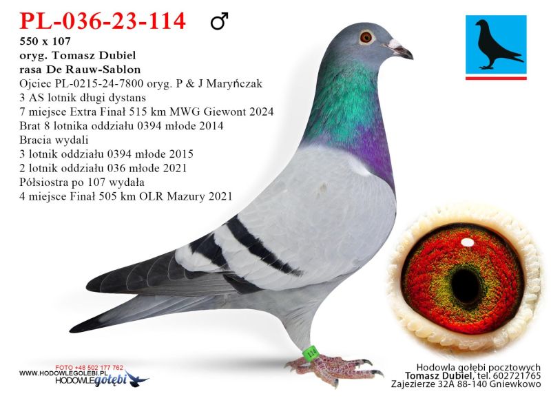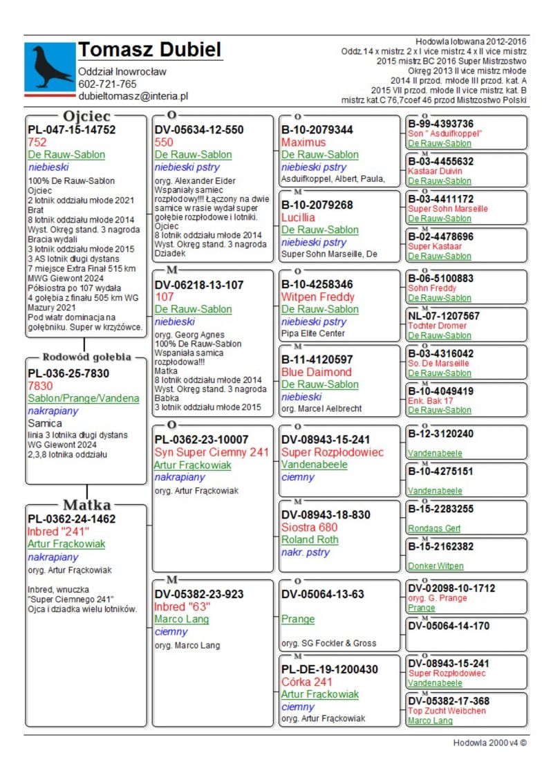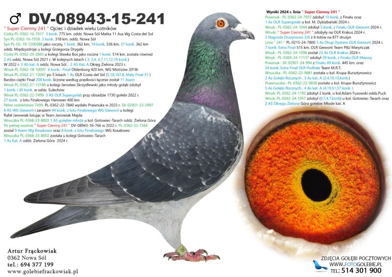 Samiczka z identycznego łączenia jak 3 ASA długi dystans, 7 miejsce Super Finał 515 km!!! Rodzeństwo od stycznia będzie lotowane na Derby Carmelo Yupi w Hiszpani. Ojciec wydał też super lotnika który w bardzo ciężkich lotach oddziałowych zdobył tytuł 2 lotnika oddziału. Ptaki z linii 550 x 107. Po gołębiach tych posiadam super gołębie rozpłodowe. W krótkim czasie ich dzieci jak i one same dały mi super lotniki, między innymi 2 i 3 lotnika oddziału, oraz wiele innych wartościowych lotników w lotach młodych i starych. Przepiękne gołębie na wymagające loty. Najlepsze umięśnienie, super budowa i aksamitne upierzenie. Do tego super wyniki na WG. U mnie WG Bojano 2023 wnuk 12 miejsce półfinał, 2024 wnuk 34 miejsce półfinał. U innych hodowców 2022 roku córka 107 wydała 4 gołębia z finału WG Mazury! W 2024 syn 107 x 550 wydał 3 ASA długi dystans, 7 miejsce Super Finał 515 km!!! ****************************************** Moje stado opiera się na ptakach które w latach 2012-2016 pozwoliły mi wygrywać w oddziale i okręgu w różnych kategoriach, lecąc w 2 różnych oddziałach 036 i 0394. Najważniejsze osiągnięcia to Mistrz okręgu kat. C 49 miejsce w Polsce, II vice Mistrz okręgu kat. B i młode, Super Mistrz Oddziału. Wszystkie wyniki dokładnie opisane na końcu aukcji. Do lotowania wróciłem „na chwilę” w 2021 r. na nowym miejscu zamieszkania w bardzo ciężkim sezonie 3 x vice Mistrz Oddziału gołębi młodych. 2,5,11,16,19,22,23,27,28,40 pozycje w klasyfikacji lotników. 3 x Mistrz sekcji oraz XIII przodownika okręgu Bydgoszcz. Zacząłem też lotowanie na WG wysyłając po kilka sztuk na sezon. 2021 – konkursy na finałach na WG Krakus i Super Gołąb, 2022 - 14 miejsce Extra Finał 518 km WG Super Gołąb, 2023 – 11 miejsce Finał 502 km WG Bojano. 2024 - 4 miejsce Półfinał WG Tatry, WG Bojano 4 miejsce lot konkursowy, 34 miejsce Półfinał, 17 miejsce Drużyna, 54, 78, 79, 81 lotnik. Po moich gołębiach w 2024 ptaki wylatały: po pełnej parze 68 miejsce Finał Super Gołąb, po samcu 8 miejsce Extra Finał WG Warmia, po samicy 16 miejsce Finał WG Roztocze, po samcu 3 AS długi dystans i 7 miejsce Extra Finał MWG Giewont. 2025 31 lotnik Derby Carmelo Yupi, 43 miejsce Extra Finał WG Tatry, 12 miejsce Finał WG Carpatia, 40 miejsce Finał WG Krakus (56 seria na 849 hodowców 2/2 w konkursie z 3 wysłanych ptaków), po samicy ode mnie 24 miejsce Finał Corabia One Loft Race. ********************** Wszystkie gołębie przyjęły komplet szczepień(Pharmavac, salmovir + ospa). Więcej informacji w rodowodach, zapraszam też do kontaktu telefonicznego, mailowego bądź WhatsApp. ********************* TRANSPORT, ptaki zostaną dostarczone transportem prywatnym w połowie grudnia, cena 1-2 szt. 100 zł, 3-6 szt. 150 zł, 7 i więcej 200 zł. Koszty transportu płatne kierowcy, za gołębie kierowcy bądź na konto, jak wygodniej. Istnieje również możliwość wcześniejszej wysyłki kurierskiej w cenie 150 zł do 6 szt. Zapraszam również do odbioru osobistego.