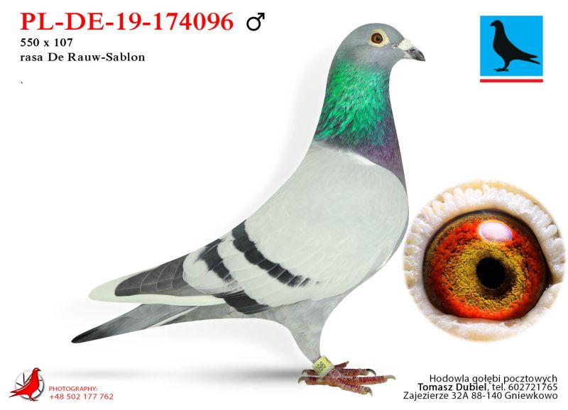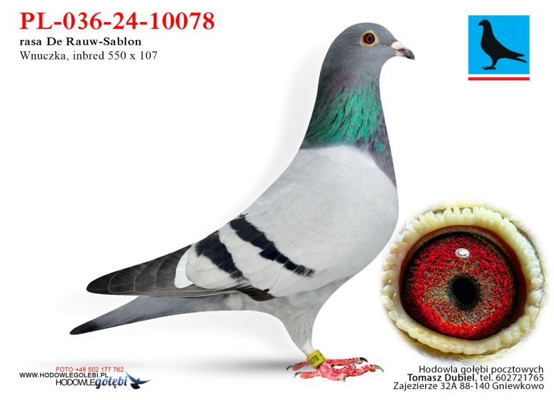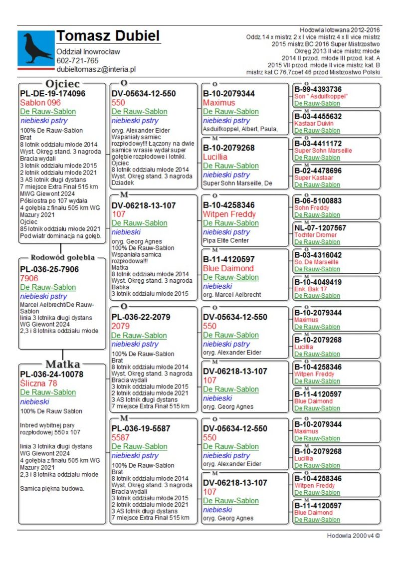 Prawdopodobnie fajna, mocna samica. Przepiękne rozpłodowe oko. Gołąb posiada białe lotki w skrzydle. Ptaki z linii 550 x 107. Po gołębiach tych posiadam super gołębie rozpłodowe. W krótkim czasie ich dzieci jak i one same dały mi super lotniki, między innymi 2 i 3 lotnika oddziału, oraz wiele innych wartościowych lotników w lotach młodych i starych. Przepiękne gołębie na wymagające loty. Najlepsze umięśnienie, super budowa i aksamitne upierzenie. Do tego super wyniki na WG. U mnie WG Bojano 2023 wnuk 12 miejsce półfinał, 2024 wnuk 34 miejsce półfinał. U innych hodowców 2022 roku córka 107 wydała 4 gołębia z finału WG Mazury! W 2024 syn 107 x 550 wydał 3 ASA długi dystans, 7 miejsce Super Finał 515 km!!! ****************************************** Moje stado opiera się na ptakach które w latach 2012-2016 pozwoliły mi wygrywać w oddziale i okręgu w różnych kategoriach, lecąc w 2 różnych oddziałach 036 i 0394. Najważniejsze osiągnięcia to Mistrz okręgu kat. C 49 miejsce w Polsce, II vice Mistrz okręgu kat. B i młode, Super Mistrz Oddziału. Wszystkie wyniki dokładnie opisane na końcu aukcji. Do lotowania wróciłem „na chwilę” w 2021 r. na nowym miejscu zamieszkania w bardzo ciężkim sezonie 3 x vice Mistrz Oddziału gołębi młodych. 2,5,11,16,19,22,23,27,28,40 pozycje w klasyfikacji lotników. 3 x Mistrz sekcji oraz XIII przodownika okręgu Bydgoszcz. Zacząłem też lotowanie na WG wysyłając po kilka sztuk na sezon. 2021 – konkursy na finałach na WG Krakus i Super Gołąb, 2022 - 14 miejsce Extra Finał 518 km WG Super Gołąb, 2023 – 11 miejsce Finał 502 km WG Bojano. 2024 - 4 miejsce Półfinał WG Tatry, WG Bojano 4 miejsce lot konkursowy, 34 miejsce Półfinał, 17 miejsce Drużyna, 54, 78, 79, 81 lotnik. Po moich gołębiach w 2024 ptaki wylatały: po pełnej parze 68 miejsce Finał Super Gołąb, po samcu 8 miejsce Extra Finał WG Warmia, po samicy 16 miejsce Finał WG Roztocze, po samcu 3 AS długi dystans i 7 miejsce Extra Finał MWG Giewont. 2025 31 lotnik Derby Carmelo Yupi, 43 miejsce Extra Finał WG Tatry, 12 miejsce Finał WG Carpatia, 40 miejsce Finał WG Krakus (56 seria na 849 hodowców 2/2 w konkursie z 3 wysłanych ptaków), po samicy ode mnie 24 miejsce Finał Corabia One Loft Race. ********************** Wszystkie gołębie przyjęły komplet szczepień(Pharmavac, salmovir + ospa). Więcej informacji w rodowodach, zapraszam też do kontaktu telefonicznego, mailowego bądź WhatsApp. ********************* TRANSPORT, ptaki zostaną dostarczone transportem prywatnym w połowie grudnia, cena 1-2 szt. 100 zł, 3-6 szt. 150 zł, 7 i więcej 200 zł. Koszty transportu płatne kierowcy, za gołębie kierowcy bądź na konto, jak wygodniej. Istnieje również możliwość wcześniejszej wysyłki kurierskiej w cenie 150 zł do 6 szt. Zapraszam również do odbioru osobistego.