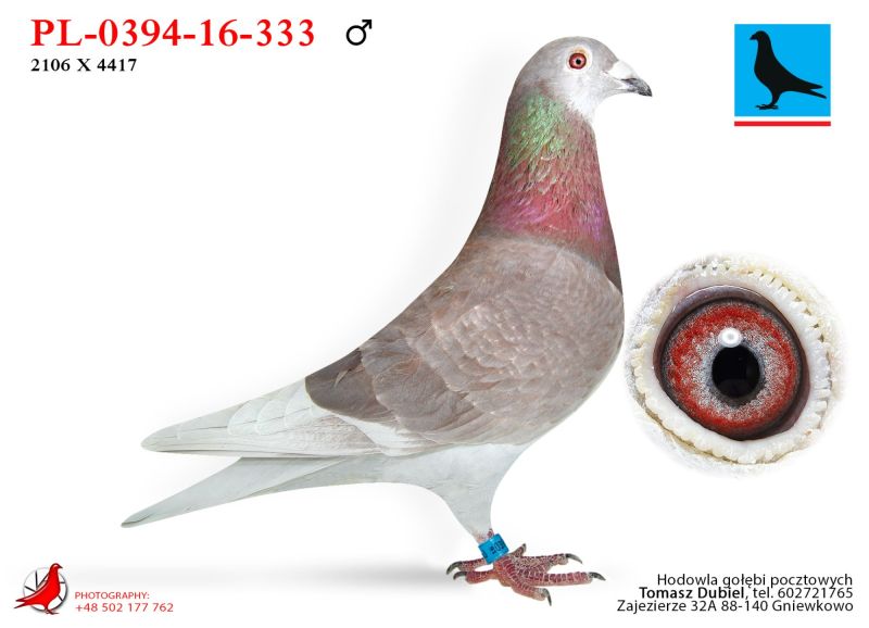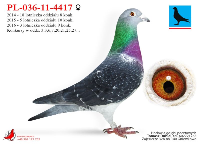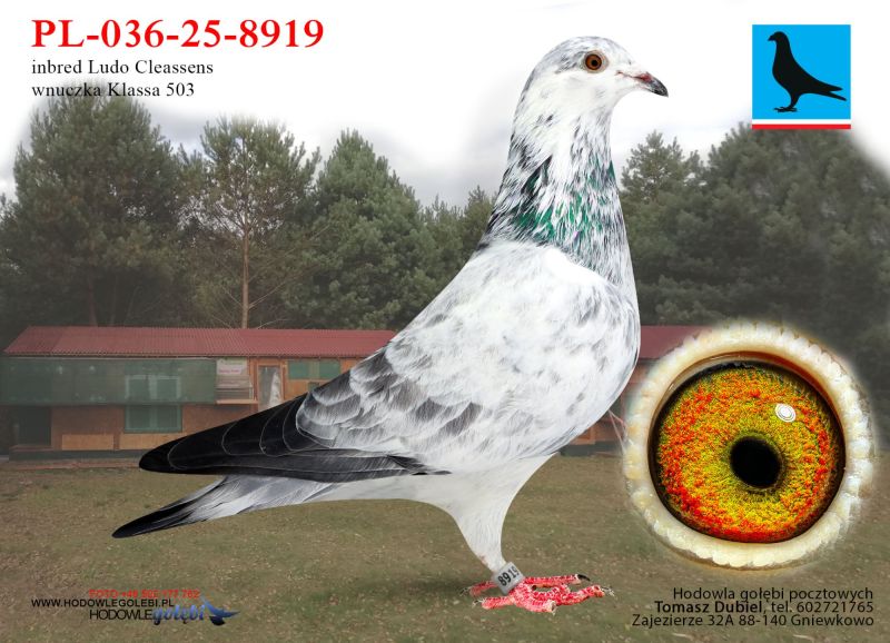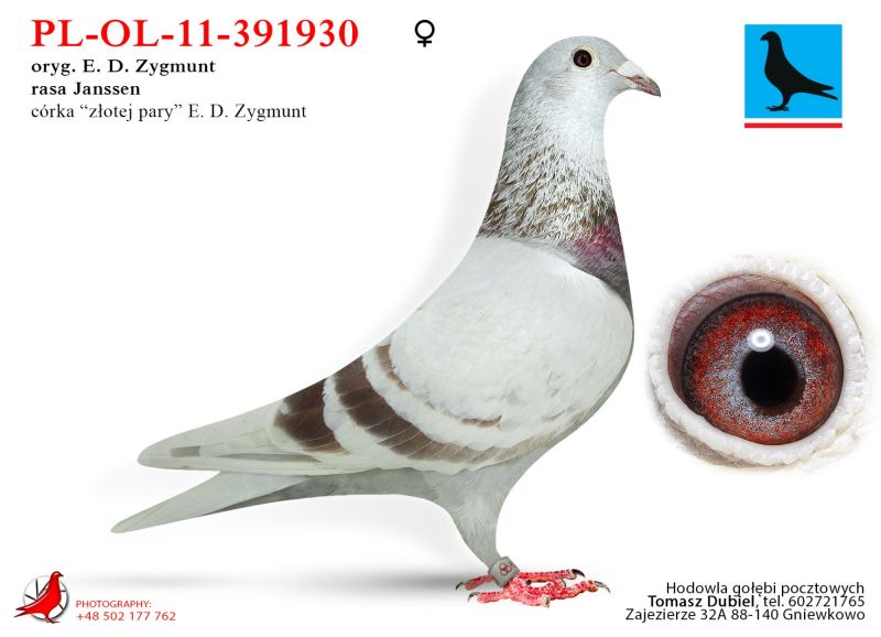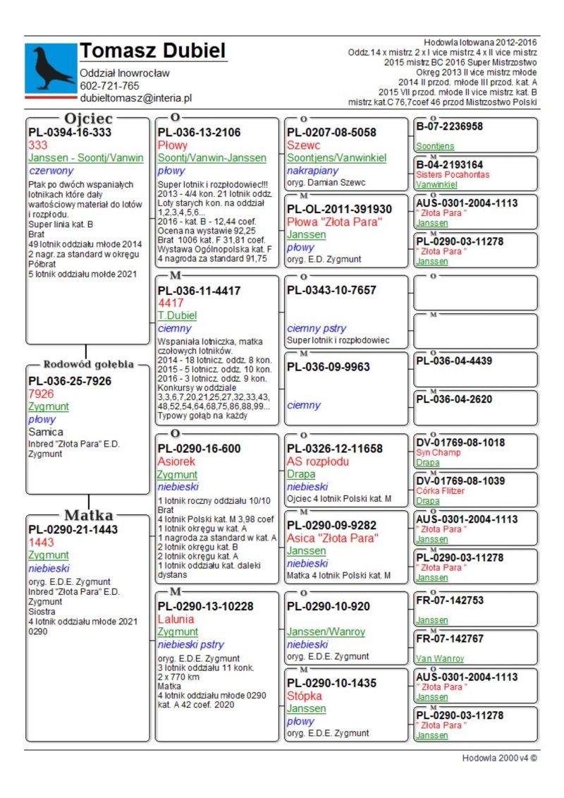 Samica. Gołębie z tej pary super w lotach i na rozpłodzie. Córka "Złotej Pary" E.D.E. Zygmunt w połączeniu z super samcem od Damiana Szewca z linii olimpijki kat. C „Pocahontas” Jefa Vanwilkel dały mi wybitne lotniki i gołębie rozpłodowe. Ptaki te zdobyły u mnie wiele czołowych nagród w lotach w różnych kategoriach, oraz na wystawach. Samiczka z „moich Zygmuntów” jest babką 1 lotnika oddziału 2024 i 5 lotnika oddziału 2023 u rodziny Zygmunt. W 2025 samczyk z tych gołębi wydał 12 gołębia z finału na WG Carpati. ****************************************** Moje stado opiera się na ptakach które w latach 2012-2016 pozwoliły mi wygrywać w oddziale i okręgu w różnych kategoriach, lecąc w 2 różnych oddziałach 036 i 0394. Najważniejsze osiągnięcia to Mistrz okręgu kat. C 49 miejsce w Polsce, II vice Mistrz okręgu kat. B i młode, Super Mistrz Oddziału. Wszystkie wyniki dokładnie opisane na końcu aukcji. Do lotowania wróciłem „na chwilę” w 2021 r. na nowym miejscu zamieszkania w bardzo ciężkim sezonie 3 x vice Mistrz Oddziału gołębi młodych. 2,5,11,16,19,22,23,27,28,40 pozycje w klasyfikacji lotników. 3 x Mistrz sekcji oraz XIII przodownika okręgu Bydgoszcz. Zacząłem też lotowanie na WG wysyłając po kilka sztuk na sezon. 2021 – konkursy na finałach na WG Krakus i Super Gołąb, 2022 - 14 miejsce Extra Finał 518 km WG Super Gołąb, 2023 – 11 miejsce Finał 502 km WG Bojano. 2024 - 4 miejsce Półfinał WG Tatry, WG Bojano 4 miejsce lot konkursowy, 34 miejsce Półfinał, 17 miejsce Drużyna, 54, 78, 79, 81 lotnik. Po moich gołębiach w 2024 ptaki wylatały: po pełnej parze 68 miejsce Finał Super Gołąb, po samcu 8 miejsce Extra Finał WG Warmia, po samicy 16 miejsce Finał WG Roztocze, po samcu 3 AS długi dystans i 7 miejsce Extra Finał MWG Giewont. 2025 31 lotnik Derby Carmelo Yupi, 43 miejsce Extra Finał WG Tatry, 12 miejsce Finał WG Carpatia, 40 miejsce Finał WG Krakus (56 seria na 849 hodowców 2/2 w konkursie z 3 wysłanych ptaków), po samicy ode mnie 24 miejsce Finał Corabia One Loft Race. ********************** Wszystkie gołębie przyjęły komplet szczepień(Pharmavac, salmovir + ospa). Więcej informacji w rodowodach, zapraszam też do kontaktu telefonicznego, mailowego bądź WhatsApp. ********************* TRANSPORT, ptaki zostaną dostarczone transportem prywatnym w połowie grudnia, cena 1-2 szt. 100 zł, 3-6 szt. 150 zł, 7 i więcej 200 zł. Koszty transportu płatne kierowcy, za gołębie kierowcy bądź na konto, jak wygodniej. Istnieje również możliwość wcześniejszej wysyłki kurierskiej w cenie 150 zł do 6 szt. Zapraszam również do odbioru osobistego.