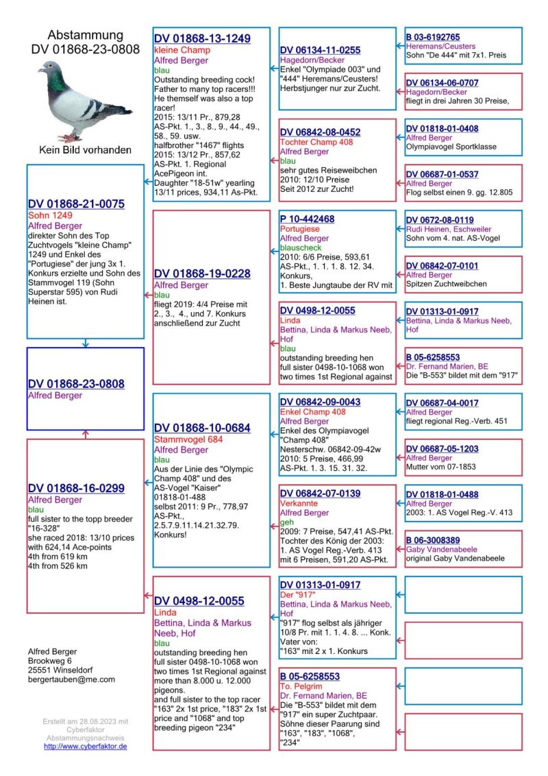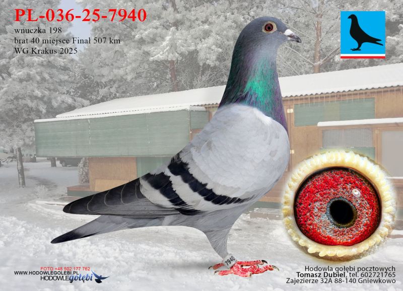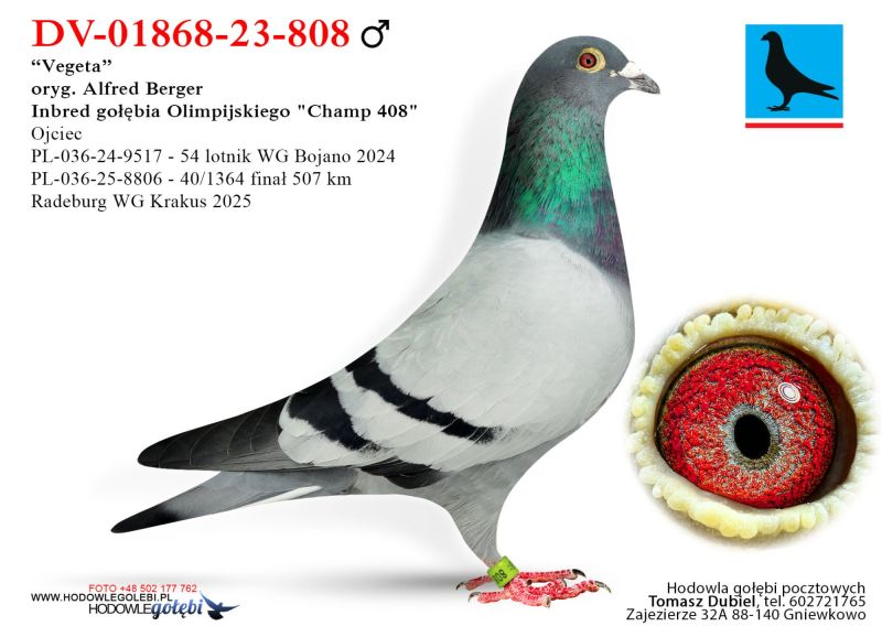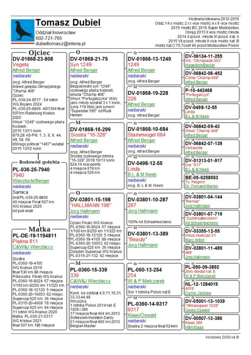 Samica, brat 40 miejsce Finał 507 km WG Krakus 2025. Rodzeństwo od stycznia będzie lotowane na Derby Carmelo Yupi w Hiszpani. Matka to córka 198 który jest tylko w tym roku przodkiem do 6080 1 asa długi dystans WG Carpatia, 6082 4 miejsce finał WG Carpatia, 6073 3 miejsce finał WG Super Gołąb. Ptaki z tej linii od razu pozwoliły mi fajnie bawić się na różnych wspólnych gołębnikach. Polecam. Ojciec to oryginalny Berger po którym młode bardzo fajnie lecą mi na WG. W tym roku na Carmelo Yupi dziecko zaliczyło cały sezon 2 x 500 km + 701 km, a dwójka gniaździaków zdobyła konkurs na finale WG Krakus i Giewont pod wiatr!!! ****************************************** Moje stado opiera się na ptakach które w latach 2012-2016 pozwoliły mi wygrywać w oddziale i okręgu w różnych kategoriach, lecąc w 2 różnych oddziałach 036 i 0394. Najważniejsze osiągnięcia to Mistrz okręgu kat. C 49 miejsce w Polsce, II vice Mistrz okręgu kat. B i młode, Super Mistrz Oddziału. Wszystkie wyniki dokładnie opisane na końcu aukcji. Do lotowania wróciłem „na chwilę” w 2021 r. na nowym miejscu zamieszkania w bardzo ciężkim sezonie 3 x vice Mistrz Oddziału gołębi młodych. 2,5,11,16,19,22,23,27,28,40 pozycje w klasyfikacji lotników. 3 x Mistrz sekcji oraz XIII przodownika okręgu Bydgoszcz. Zacząłem też lotowanie na WG wysyłając po kilka sztuk na sezon. 2021 – konkursy na finałach na WG Krakus i Super Gołąb, 2022 - 14 miejsce Extra Finał 518 km WG Super Gołąb, 2023 – 11 miejsce Finał 502 km WG Bojano. 2024 - 4 miejsce Półfinał WG Tatry, WG Bojano 4 miejsce lot konkursowy, 34 miejsce Półfinał, 17 miejsce Drużyna, 54, 78, 79, 81 lotnik. Po moich gołębiach w 2024 ptaki wylatały: po pełnej parze 68 miejsce Finał Super Gołąb, po samcu 8 miejsce Extra Finał WG Warmia, po samicy 16 miejsce Finał WG Roztocze, po samcu 3 AS długi dystans i 7 miejsce Extra Finał MWG Giewont. 2025 31 lotnik Derby Carmelo Yupi, 43 miejsce Extra Finał WG Tatry, 12 miejsce Finał WG Carpatia, 40 miejsce Finał WG Krakus (56 seria na 849 hodowców 2/2 w konkursie z 3 wysłanych ptaków), po samicy ode mnie 24 miejsce Finał Corabia One Loft Race. ********************** Wszystkie gołębie przyjęły komplet szczepień(Pharmavac, salmovir + ospa). Więcej informacji w rodowodach, zapraszam też do kontaktu telefonicznego, mailowego bądź WhatsApp. ********************* TRANSPORT, ptaki zostaną dostarczone transportem prywatnym w połowie grudnia, cena 1-2 szt. 100 zł, 3-6 szt. 150 zł, 7 i więcej 200 zł. Koszty transportu płatne kierowcy, za gołębie kierowcy bądź na konto, jak wygodniej. Istnieje również możliwość wcześniejszej wysyłki kurierskiej w cenie 150 zł do 6 szt. Zapraszam również do odbioru osobistego.