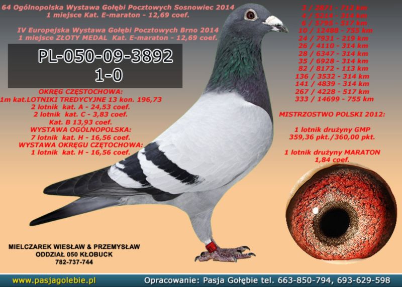 Prawdopodobnie samiczka. ****************************************** Moje stado opiera się na ptakach które w latach 2012-2016 pozwoliły mi wygrywać w oddziale i okręgu w różnych kategoriach, lecąc w 2 różnych oddziałach 036 i 0394. Najważniejsze osiągnięcia to Mistrz okręgu kat. C 49 miejsce w Polsce, II vice Mistrz okręgu kat. B i młode, Super Mistrz Oddziału. Wszystkie wyniki dokładnie opisane na końcu aukcji. Do lotowania wróciłem „na chwilę” w 2021 r. na nowym miejscu zamieszkania w bardzo ciężkim sezonie 3 x vice Mistrz Oddziału gołębi młodych. 2,5,11,16,19,22,23,27,28,40 pozycje w klasyfikacji lotników. 3 x Mistrz sekcji oraz XIII przodownika okręgu Bydgoszcz. Zacząłem też lotowanie na WG wysyłając po kilka sztuk na sezon. 2021 – konkursy na finałach na WG Krakus i Super Gołąb, 2022 - 14 miejsce Extra Finał 518 km WG Super Gołąb, 2023 – 11 miejsce Finał 502 km WG Bojano. 2024 - 4 miejsce Półfinał WG Tatry, WG Bojano 4 miejsce lot konkursowy, 34 miejsce Półfinał, 17 miejsce Drużyna, 54, 78, 79, 81 lotnik. Po moich gołębiach w 2024 ptaki wylatały: po pełnej parze 68 miejsce Finał Super Gołąb, po samcu 8 miejsce Extra Finał WG Warmia, po samicy 16 miejsce Finał WG Roztocze, po samcu 3 AS długi dystans i 7 miejsce Extra Finał MWG Giewont. 2025 31 lotnik Derby Carmelo Yupi, 43 miejsce Extra Finał WG Tatry, 12 miejsce Finał WG Carpatia, 40 miejsce Finał WG Krakus (56 seria na 849 hodowców 2/2 w konkursie z 3 wysłanych ptaków), po samicy ode mnie 24 miejsce Finał Corabia One Loft Race. ********************** Wszystkie gołębie przyjęły komplet szczepień(Pharmavac, salmovir + ospa). Więcej informacji w rodowodach, zapraszam też do kontaktu telefonicznego, mailowego bądź WhatsApp. ********************* TRANSPORT, ptaki zostaną dostarczone transportem prywatnym w połowie grudnia, cena 1-2 szt. 100 zł, 3-6 szt. 150 zł, 7 i więcej 200 zł. Koszty transportu płatne kierowcy, za gołębie kierowcy bądź na konto, jak wygodniej. Istnieje również możliwość wcześniejszej wysyłki kurierskiej w cenie 150 zł do 6 szt. Zapraszam również do odbioru osobistego.
