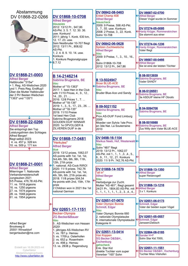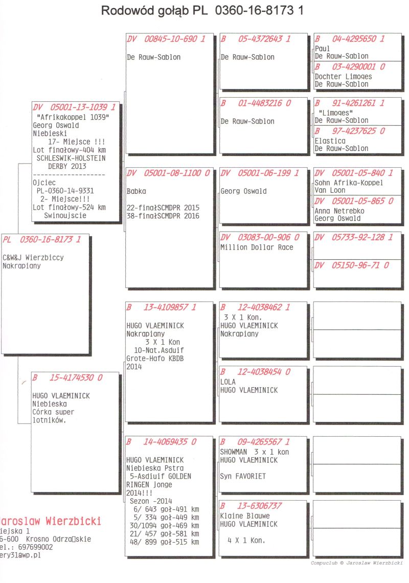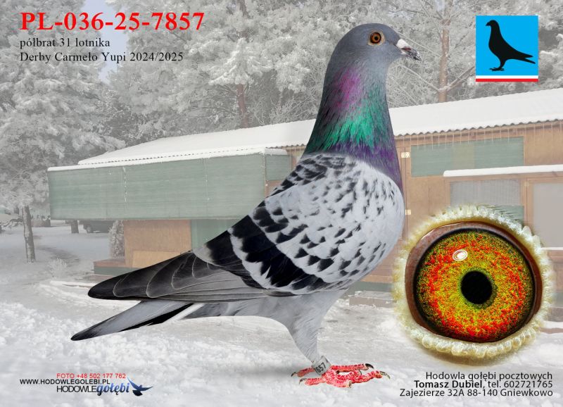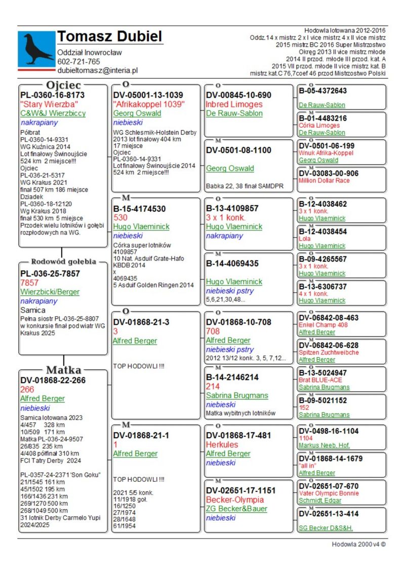 Samica, siostra w konkursie Finał 507 km WG Krakus 2025. Rodzeństwo od stycznia będzie lotowane na Derby Carmelo Yupi w Hiszpani. Ptaki z tej linii od razu pozwoliły mi fajnie bawić się na różnych wspólnych gołębnikach. Polecam. Ojciec to oryginalny Berger po którym młode bardzo fajnie lecą mi na WG. W tym roku na Carmelo Yupi dziecko zaliczyło cały sezon 2 x 500 km + 701 km, a dwójka gniaździaków zdobyła konkurs na finale WG Krakus i Giewont pod wiatr!!! ****************************************** Moje stado opiera się na ptakach które w latach 2012-2016 pozwoliły mi wygrywać w oddziale i okręgu w różnych kategoriach, lecąc w 2 różnych oddziałach 036 i 0394. Najważniejsze osiągnięcia to Mistrz okręgu kat. C 49 miejsce w Polsce, II vice Mistrz okręgu kat. B i młode, Super Mistrz Oddziału. Wszystkie wyniki dokładnie opisane na końcu aukcji. Do lotowania wróciłem „na chwilę” w 2021 r. na nowym miejscu zamieszkania w bardzo ciężkim sezonie 3 x vice Mistrz Oddziału gołębi młodych. 2,5,11,16,19,22,23,27,28,40 pozycje w klasyfikacji lotników. 3 x Mistrz sekcji oraz XIII przodownika okręgu Bydgoszcz. Zacząłem też lotowanie na WG wysyłając po kilka sztuk na sezon. 2021 – konkursy na finałach na WG Krakus i Super Gołąb, 2022 - 14 miejsce Extra Finał 518 km WG Super Gołąb, 2023 – 11 miejsce Finał 502 km WG Bojano. 2024 - 4 miejsce Półfinał WG Tatry, WG Bojano 4 miejsce lot konkursowy, 34 miejsce Półfinał, 17 miejsce Drużyna, 54, 78, 79, 81 lotnik. Po moich gołębiach w 2024 ptaki wylatały: po pełnej parze 68 miejsce Finał Super Gołąb, po samcu 8 miejsce Extra Finał WG Warmia, po samicy 16 miejsce Finał WG Roztocze, po samcu 3 AS długi dystans i 7 miejsce Extra Finał MWG Giewont. 2025 31 lotnik Derby Carmelo Yupi, 43 miejsce Extra Finał WG Tatry, 12 miejsce Finał WG Carpatia, 40 miejsce Finał WG Krakus (56 seria na 849 hodowców 2/2 w konkursie z 3 wysłanych ptaków), po samicy ode mnie 24 miejsce Finał Corabia One Loft Race. ********************** Wszystkie gołębie przyjęły komplet szczepień(Pharmavac, salmovir + ospa). Więcej informacji w rodowodach, zapraszam też do kontaktu telefonicznego, mailowego bądź WhatsApp. ********************* TRANSPORT, ptaki zostaną dostarczone transportem prywatnym w połowie grudnia, cena 1-2 szt. 100 zł, 3-6 szt. 150 zł, 7 i więcej 200 zł. Koszty transportu płatne kierowcy, za gołębie kierowcy bądź na konto, jak wygodniej. Istnieje również możliwość wcześniejszej wysyłki kurierskiej w cenie 150 zł do 6 szt. Zapraszam również do odbioru osobistego.