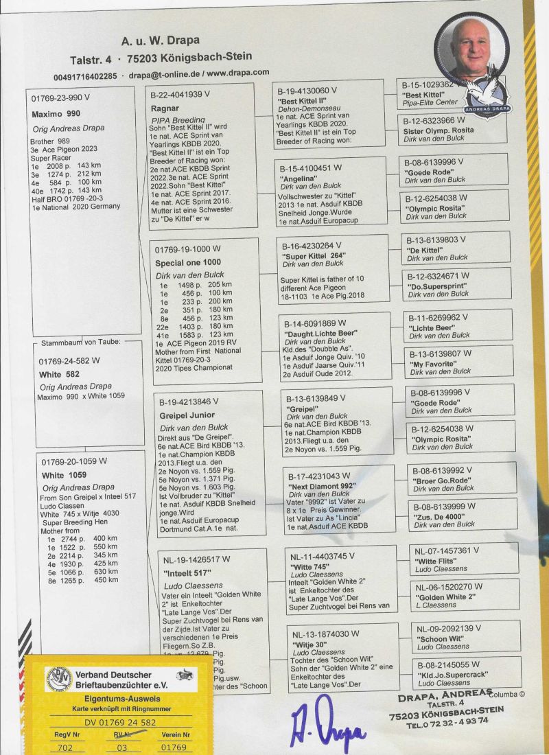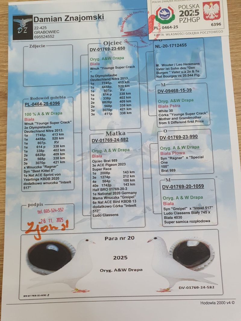 Oryginalny gołąb z hodowli Damian Znajomskiego. Szczegóły pochodzenia w rodowodzie. Gołębie wychowane w boksach indywidualnych . Tylko Opcja KUP TERAZ. Możliwy transport. Tel. 695-524-552