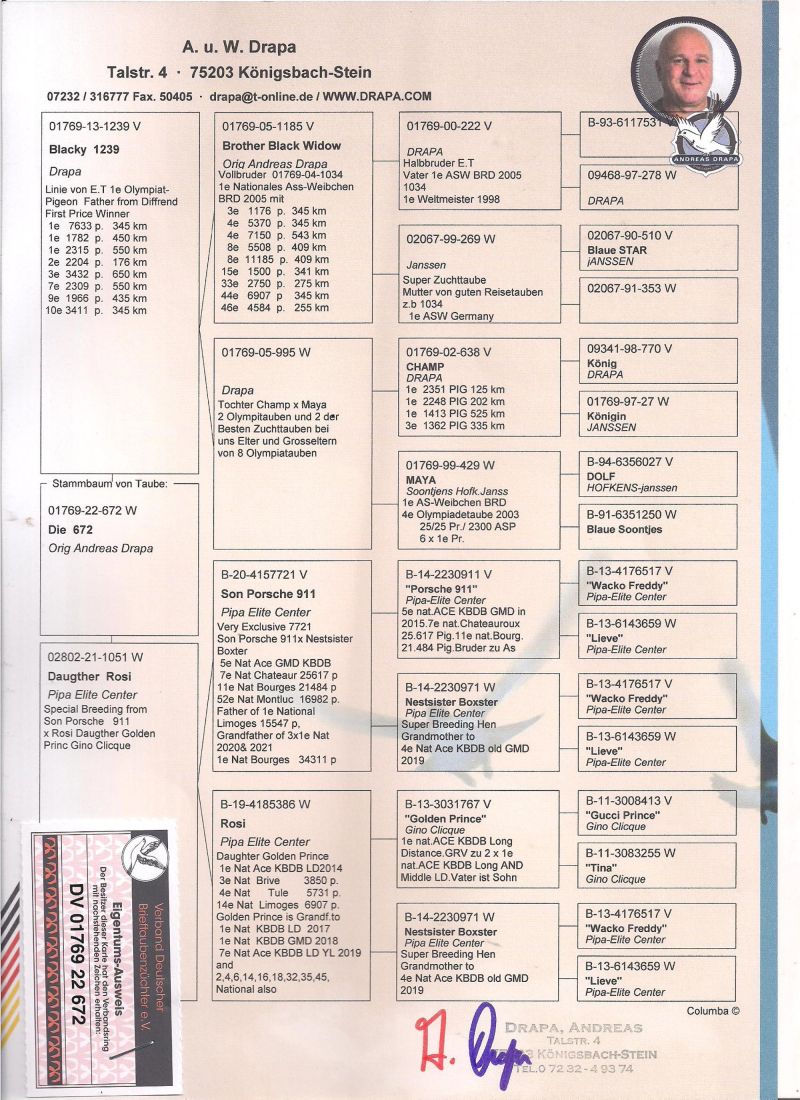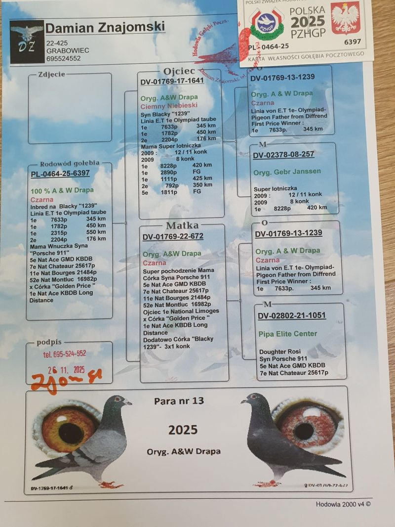 Oryginalny gołąb z hodowli Damian Znajomskiego. Szczegóły pochodzenia w rodowodzie. Gołębie wychowane w boksach indywidualnych . Tylko Opcja KUP TERAZ. Możliwy transport. Tel. 695-524-552