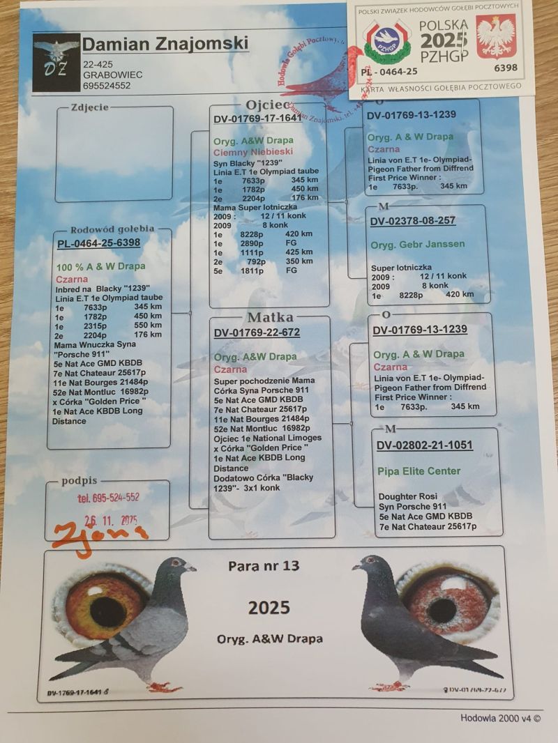 Oryginalny gołąb z hodowli Damian Znajomskiego. Szczegóły pochodzenia w rodowodzie. Gołębie wychowane w boksach indywidualnych . Tylko Opcja KUP TERAZ. Możliwy transport. Tel. 695-524-552