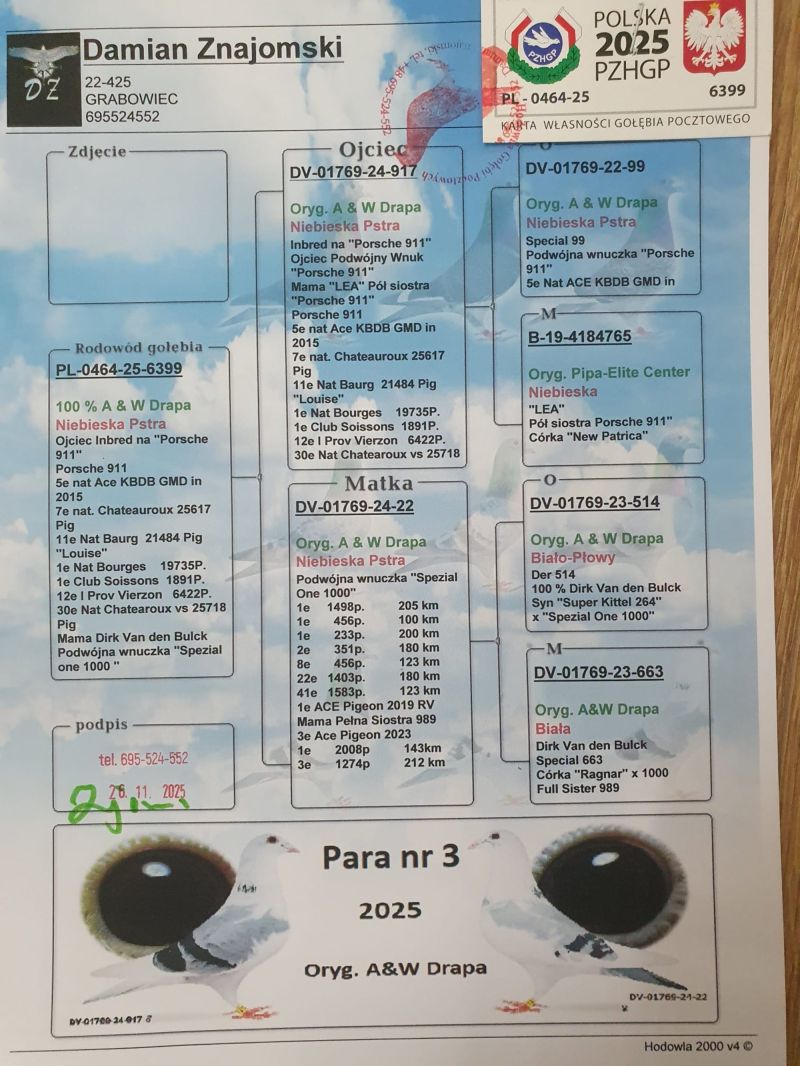 Oryginalny gołąb z hodowli Damian Znajomskiego. Szczegóły pochodzenia w rodowodzie. Gołębie wychowane w boksach indywidualnych . Tylko Opcja KUP TERAZ. Możliwy transport. Tel. 695-524-552