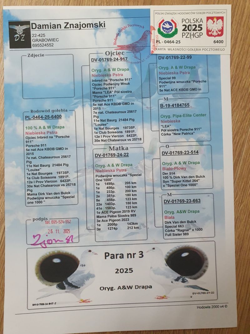 Oryginalny gołąb z hodowli Damian Znajomskiego. Szczegóły pochodzenia w rodowodzie. Gołębie wychowane w boksach indywidualnych . Tylko Opcja KUP TERAZ. Możliwy transport. Tel. 695-524-552