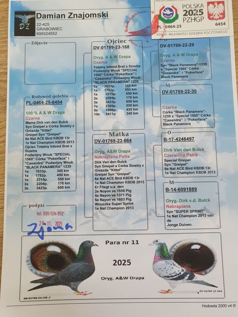 Oryginalny gołąb z hodowli Damian Znajomskiego. Szczegóły pochodzenia w rodowodzie. Gołębie wychowane w boksach indywidualnych . Tylko Opcja KUP TERAZ. Możliwy transport. Tel. 695-524-552