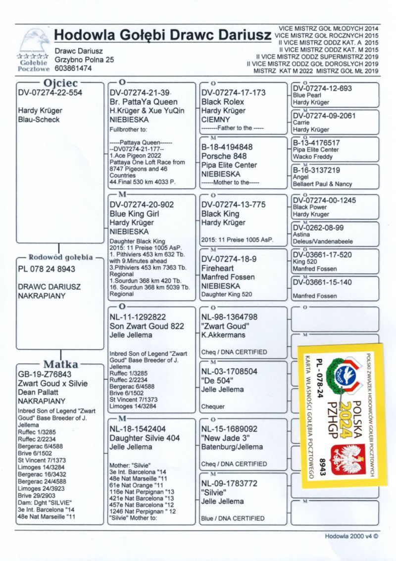 Witam. Gołąb pochodzi z hodowli Szady GKW. Szczegóły pochodzenia w rodowodzie. Zaszczepiony 16.09.2025 szczepionką RP VACC. Płatność za gołębia - przelew na konto. Transport będę organizował po zakończeniu wszystkich aukcji w połowie grudnia. Koszt transportu indywidualnie w zależności od odległości i ilości gołębi. Możliwa trasa 15.12.2025 - Wrocław - Gliwice - Żory - Jastrzębie Zdrój - Ostrawa. Możliwe trasa 20.12 - Wrocław - Poznań - Konin - Garwolin - Rawa Mazowiecka - Piotrków Trybunalski - Bełchatów - Wieluń - Wrocław. Co tydzień / Wrocław - Zgorzelec oraz Wrocław - Olszyna. Prawdopodobnie samczyk. Więcej informacji pod nr tel. : 698 760 309.