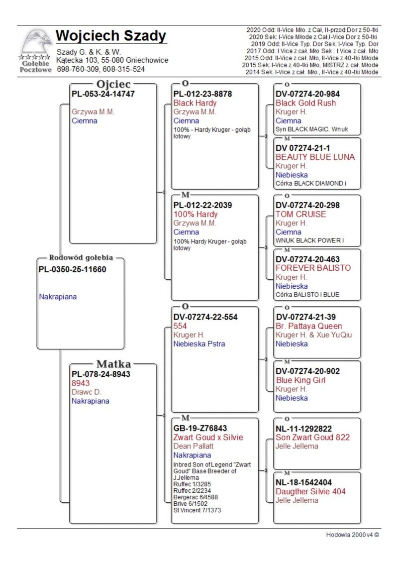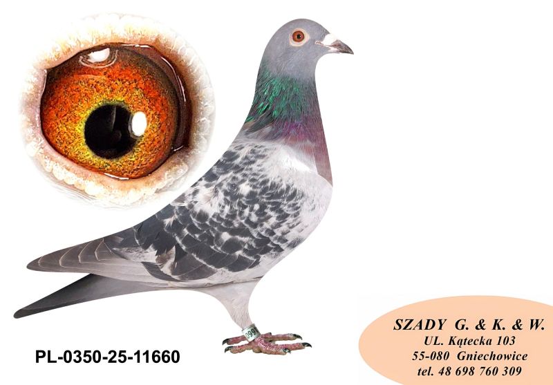 Witam. Gołąb pochodzi z hodowli Szady GKW. Szczegóły pochodzenia w rodowodzie. Zaszczepiony 16.09.2025 szczepionką RP VACC. Płatność za gołębia - przelew na konto. Transport będę organizował po zakończeniu wszystkich aukcji w połowie grudnia. Koszt transportu indywidualnie w zależności od odległości i ilości gołębi. Możliwa trasa 15.12.2025 - Wrocław - Gliwice - Żory - Jastrzębie Zdrój - Ostrawa. Możliwe trasa 20.12 - Wrocław - Poznań - Konin - Garwolin - Rawa Mazowiecka - Piotrków Trybunalski - Bełchatów - Wieluń - Wrocław. Co tydzień / Wrocław - Zgorzelec oraz Wrocław - Olszyna. Prawdopodobnie samczyk. Więcej informacji pod nr tel. : 698 760 309.