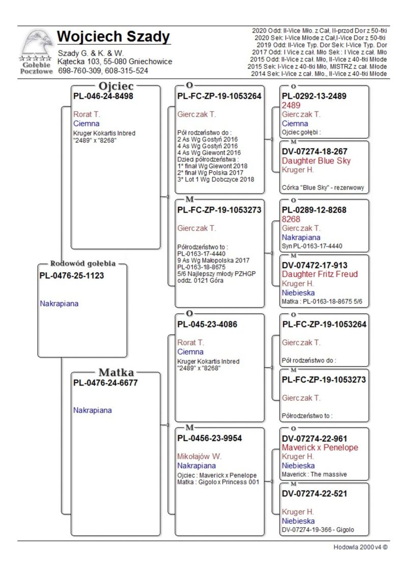 Witam. Gołąb pochodzi z hodowli Szady GKW. Szczegóły pochodzenia w rodowodzie. Zaszczepiony 16.09.2025 szczepionką RP VACC. Płatność za gołębia - przelew na konto. Transport będę organizował po zakończeniu wszystkich aukcji w połowie grudnia. Koszt transportu indywidualnie w zależności od odległości i ilości gołębi. Możliwa trasa 15.12.2025 - Wrocław - Gliwice - Żory - Jastrzębie Zdrój - Ostrawa. Możliwe trasa 20.12 - Wrocław - Poznań - Konin - Garwolin - Rawa Mazowiecka - Piotrków Trybunalski - Bełchatów - Wieluń - Wrocław. Co tydzień / Wrocław - Zgorzelec oraz Wrocław - Olszyna. Prawdopodobnie samczyk. Więcej informacji pod nr tel. : 698 760 309.