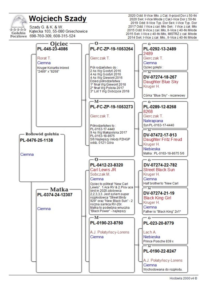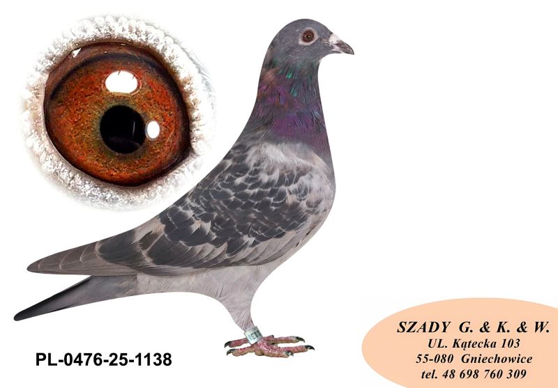 Witam. Gołąb pochodzi z hodowli Szady GKW. Szczegóły pochodzenia w rodowodzie. Zaszczepiony 16.09.2025 szczepionką RP VACC. Płatność za gołębia - przelew na konto. Transport będę organizował po zakończeniu wszystkich aukcji w połowie grudnia. Koszt transportu indywidualnie w zależności od odległości i ilości gołębi. Możliwa trasa 15.12.2025 - Wrocław - Gliwice - Żory - Jastrzębie Zdrój - Ostrawa. Możliwe trasa 20.12 - Wrocław - Poznań - Konin - Garwolin - Rawa Mazowiecka - Piotrków Trybunalski - Bełchatów - Wieluń - Wrocław. Co tydzień / Wrocław - Zgorzelec oraz Wrocław - Olszyna. Prawdopodobnie samica. Więcej informacji pod nr tel. : 698 760 309.