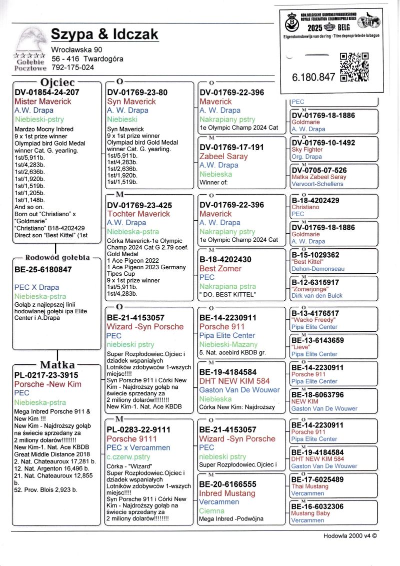 Profesjonalna hodowla z wieloletnim doświadczeniem, posiadająca w swoim stadzie materiał najwyższej światowej klasy. Więcej informacji w załączonych materiałach oraz pod nr tel. 792-175-024 Oferowany gołąb to prawdopodobnie SAMICA. Płeć pisana orientacyjnie Wysyłka 100 zł
