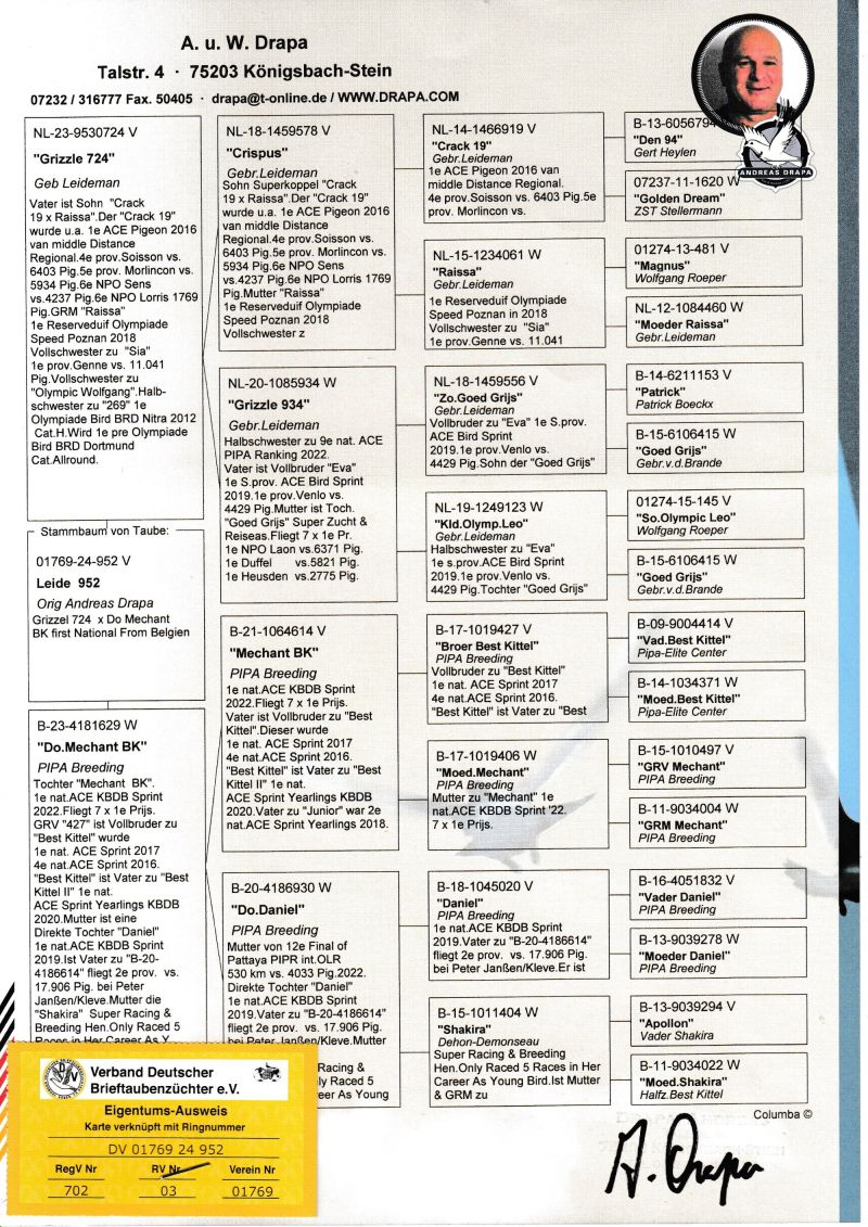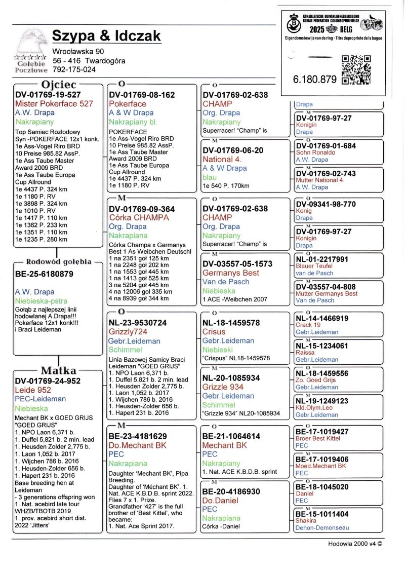 Profesjonalna hodowla z wieloletnim doświadczeniem, posiadająca w swoim stadzie materiał najwyższej światowej klasy. Więcej informacji w załączonych materiałach oraz pod nr tel. 792-175-024 Oferowany gołąb to prawdopodobnie SAMICA. Płeć pisana orientacyjnie Wysyłka 100 zł