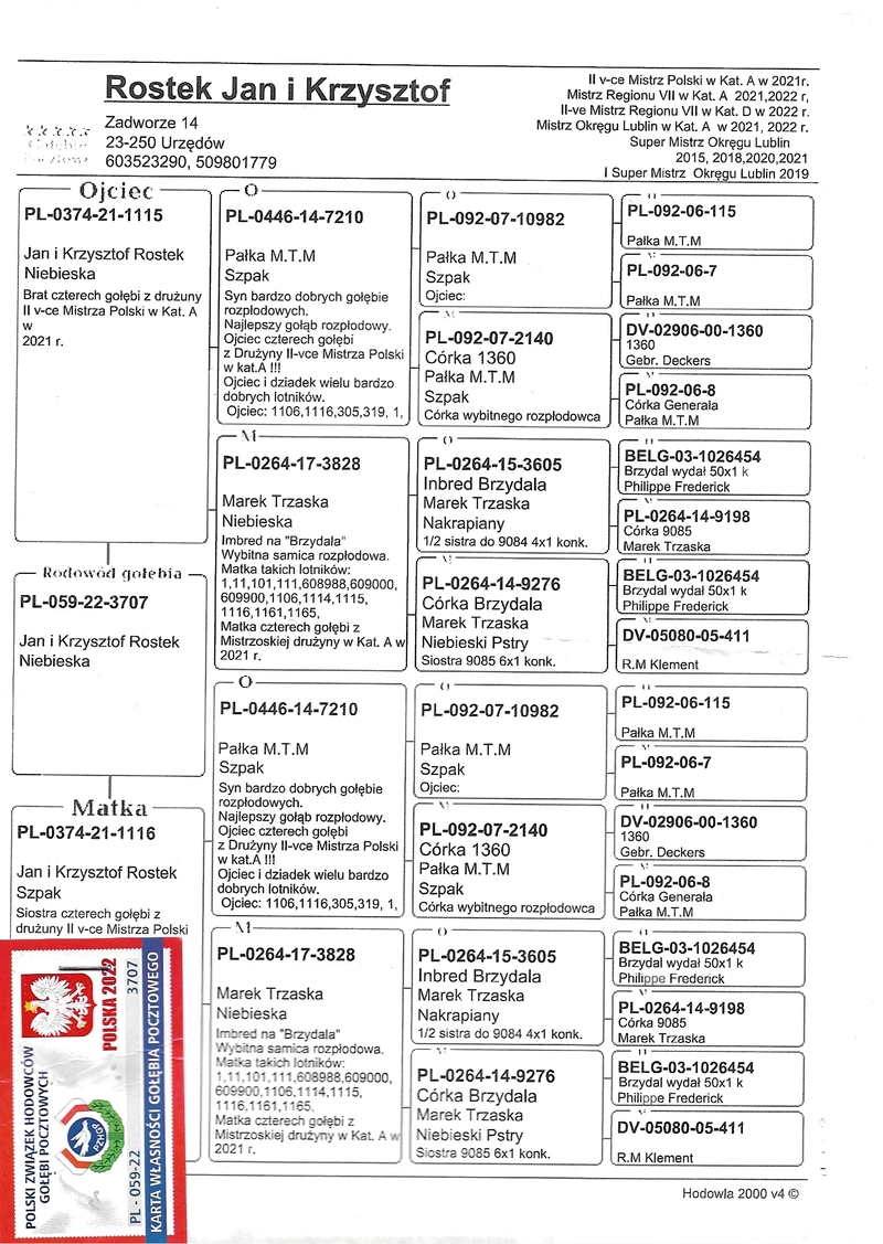 Oryginalny gołąb z hodowli Rostek Jan i Krzysztof. Podwójny wnuk Szpaka 7210 najlepszego gołębia rozpłodowego. Babka tego gołębia jest wybitna samica rozpłodowa INBRED "Brzydala". Szczegóły pochodzenia w rodowodzie. Więcej informacji pod nr. 793 393 822