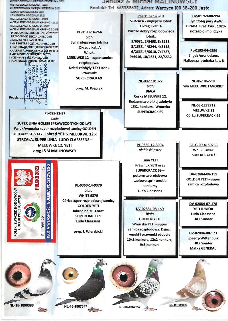 Oryginalny gołąb z hodowli Janusza i Michała Malinowskich. Samiec o kapitalnej budowie Ojciec to syn najlepszego lotnika kat. A linia MEEUWKE 12, Matka to Inbred na YETI oraz SUPERCRACK69. Po pełnym programie lotów gołębi młodych. Ojciec 23-2076 4\5 m.in 34,64. Szczegóły pochodzenia w rodowodzie. Więcej informacji pod nr. 793 393 822