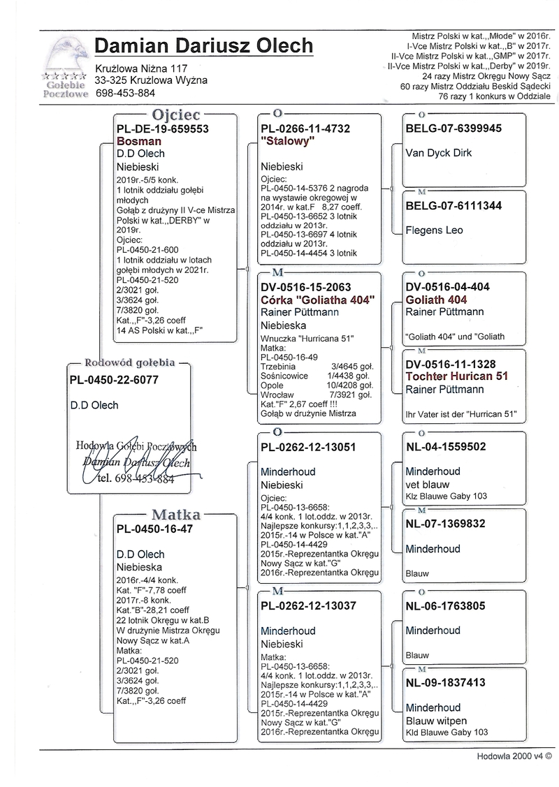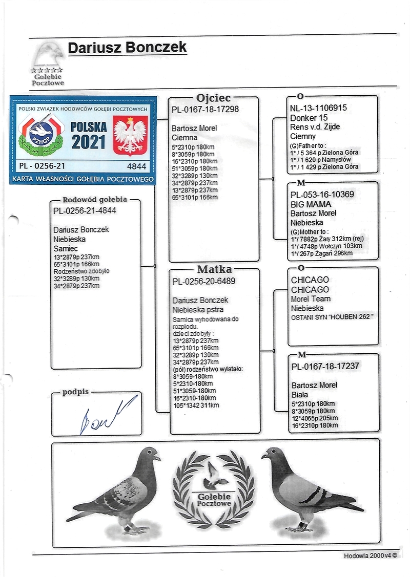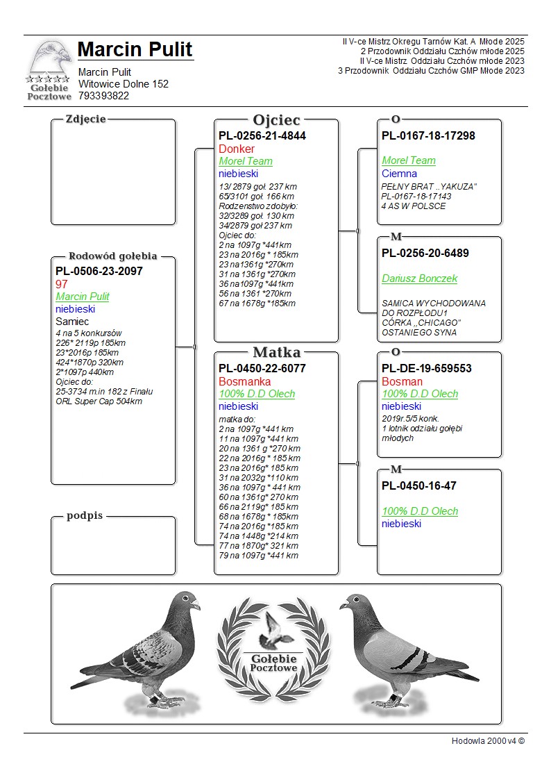 Oryginalny gołąb z hodowli Marcin Pulit. Gołąb po pełnym programie lotowym 4\5 k. 2 konkurs z Żary 440 km. Ojciec do PL-0506-25-3734 182 miejsce z lotu Finałowego OLR SUPER CUP 504km.Ojciec to wnuk DONKER 15 & CHICAGO podstawowych rozpłodowców w hodowli Morel Team. Matka to córka Bosmana 1 lotnika oddziału gołębi młodych. Szczegóły pochodzenia w rodowodzie. Więcej informacji pod nr. 793 393 822