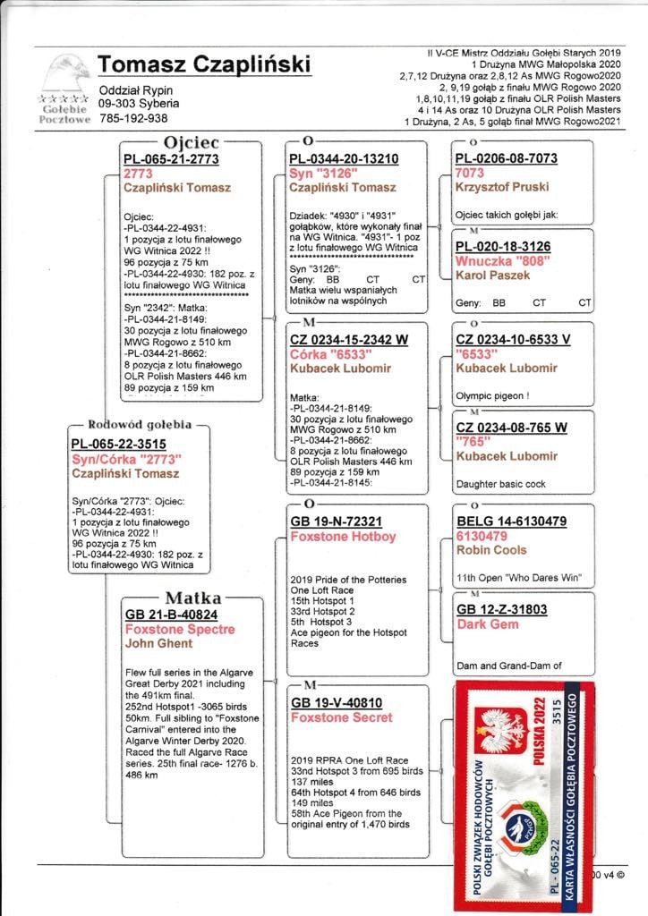 PL-065-22-3515 - oryg. Tomasz Czapliński, półsiostra 1 gołębia z finału WG Witnica