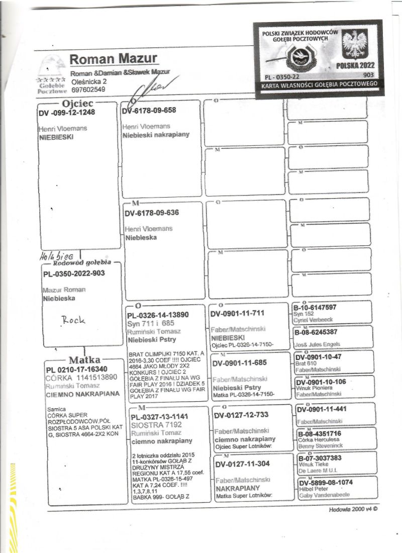 Więcej informacji w rodowodzie oraz pod nr telefonu Grzegorz 663602297. zapewniam transport wszystkim kupionym gołębiom na moich aukcjach