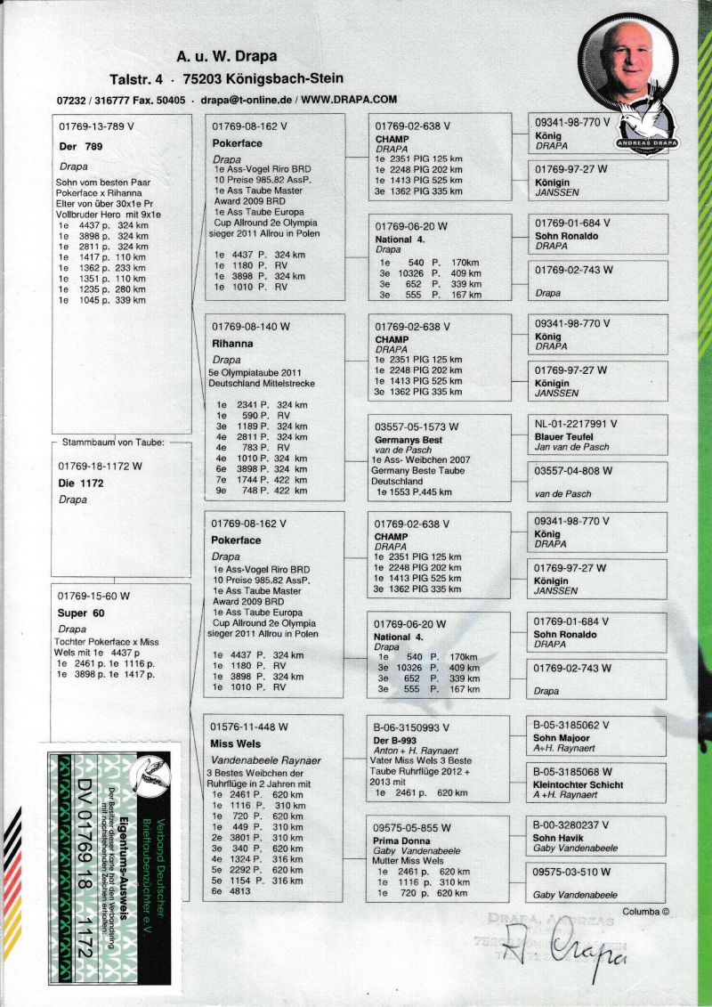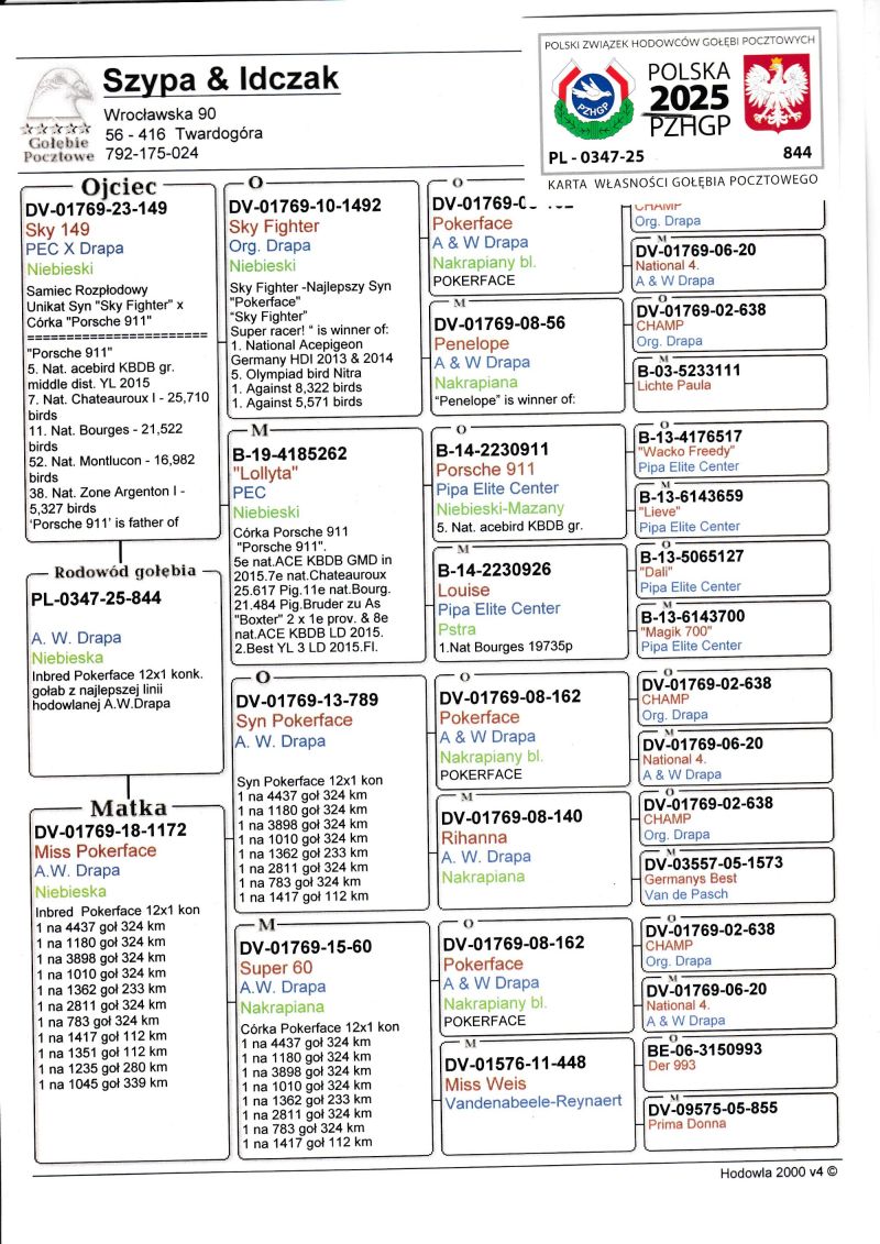 Profesjonalna hodowla z wieloletnim doświadczeniem, posiadająca w swoim stadzie materiał najwyższej światowej klasy. Więcej informacji w załączonych materiałach oraz pod nr tel. 792-175-024 Oferowany gołąb to prawdopodobnie SAMICA. Płeć pisana orientacyjnie Wysyłka 100 zł