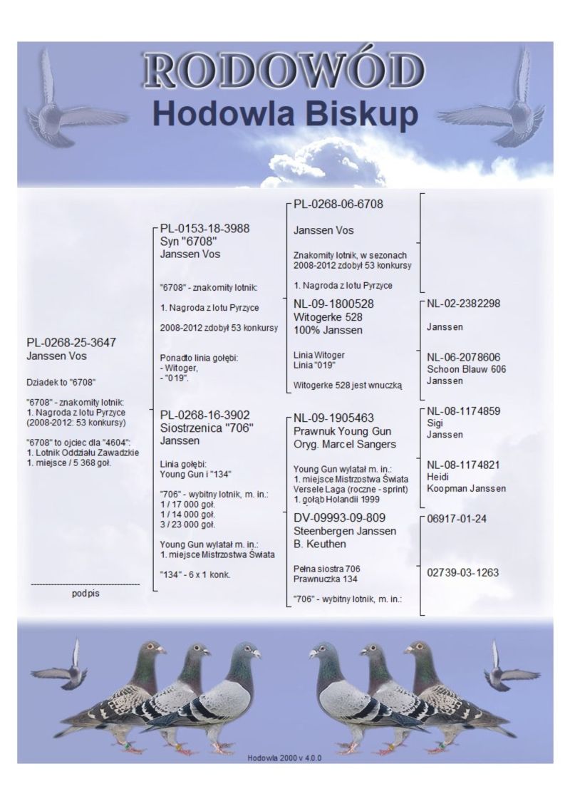 Dziadek to "6708"; "6708" - znakomity lotnik: 1.Nagroda z lotu Pyrzyce (2008-2012: 53 konkursy); "6708" to ojciec dla "4604": 1.Lotnik Oddziału Zawadzkie, 1.miejsce / 5 368 goł.; Koszt wysyłki 150 zł ///