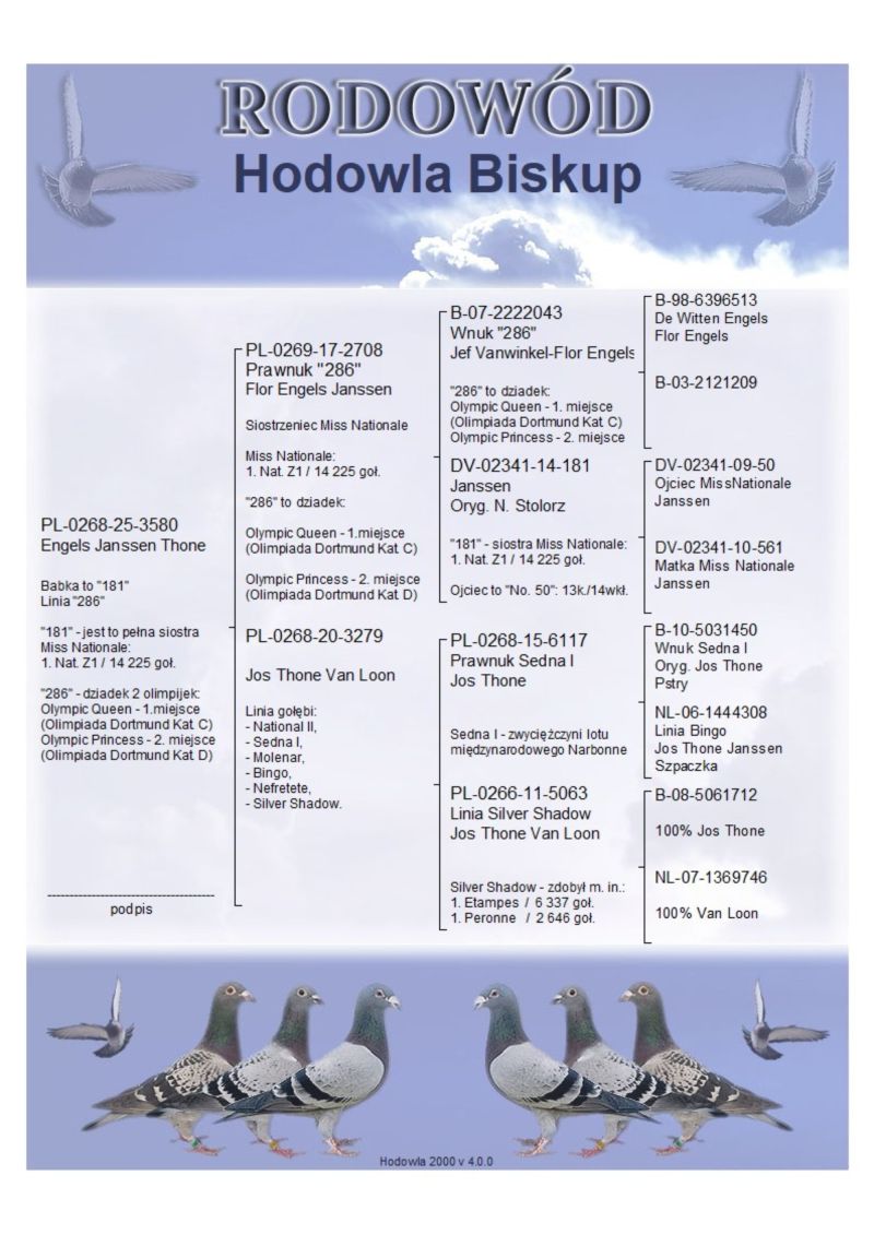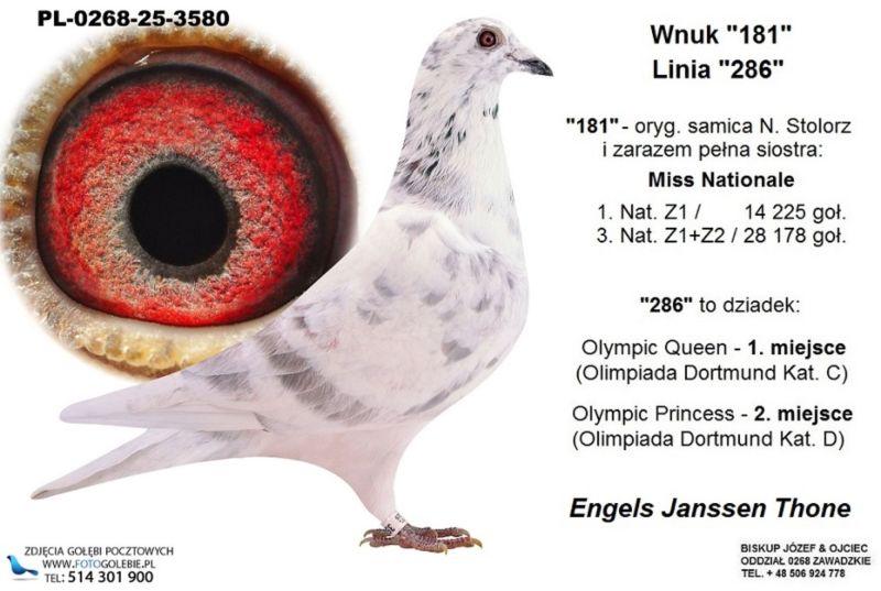 Babka to "181"; Linia "286"; "181" - jest to pełna siostra Miss Nationale: 1.Nat. Z1 / 14 225 goł.; "286" - dziadek 2 olimpijek: Olympic Queen - 1.miejsce (Olimpiada Dortmund Kat. C), Olympic Princess - 2. miejsce (Olimpiada Dortmund Kat. D); Koszt wysyłki 150 zł