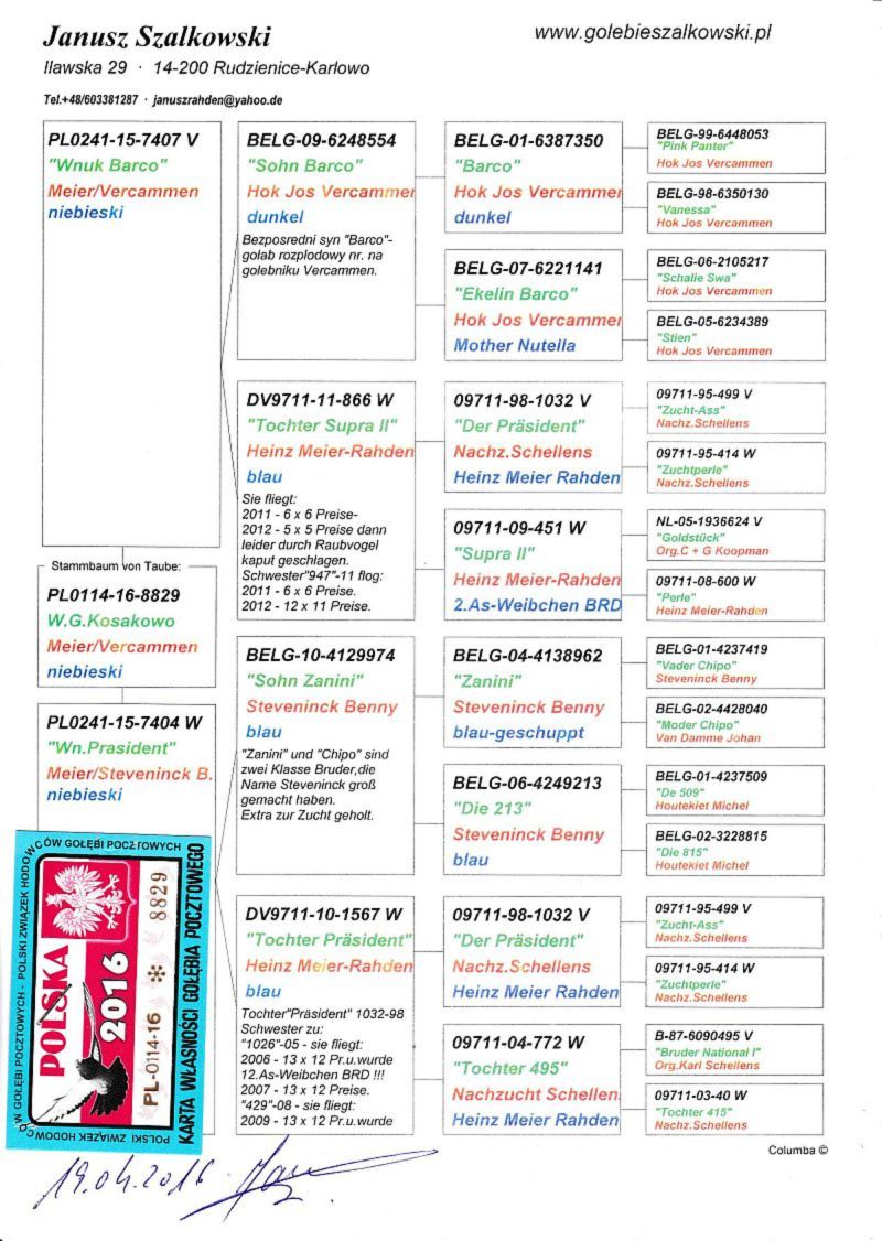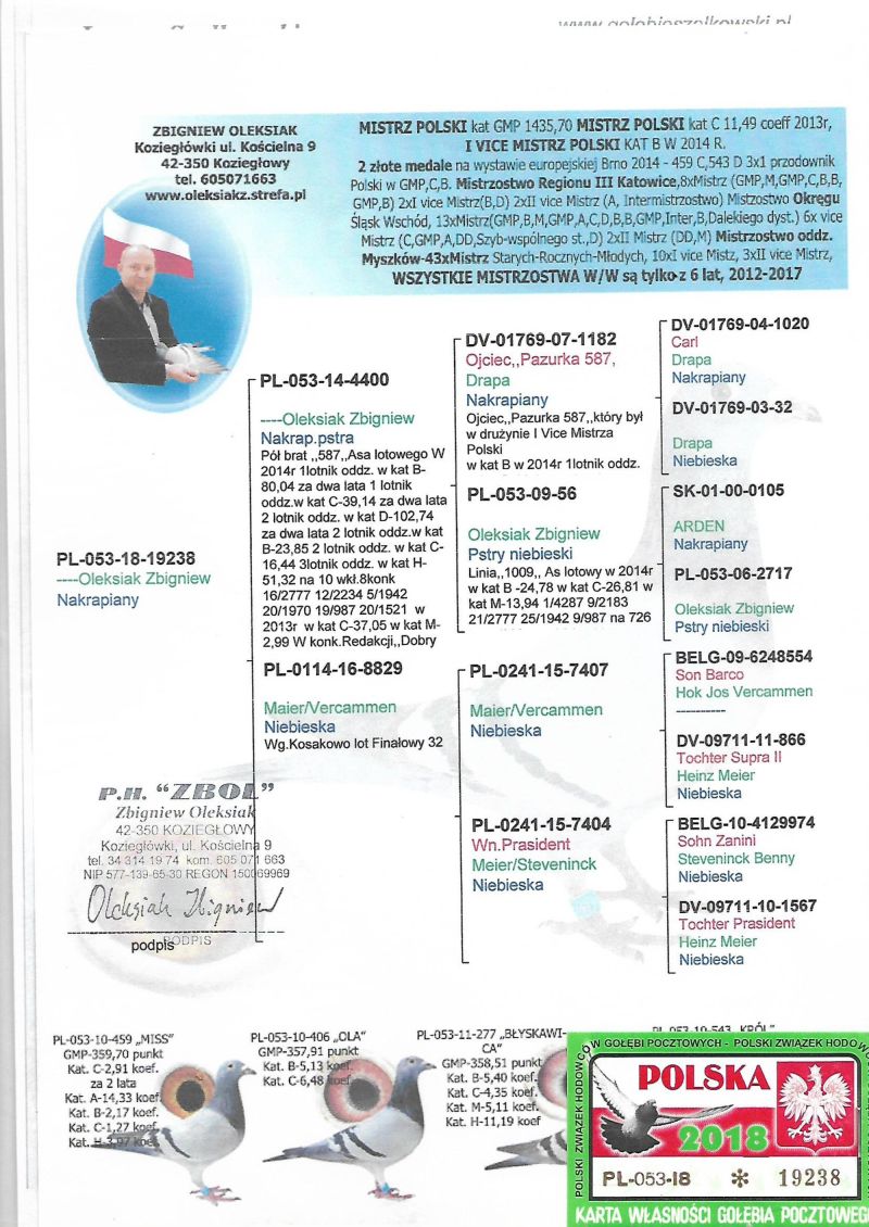 Z POWODU ZMIANY LOKALIZACJI GOŁĘBNIKA LIKWIDACJA GOŁĘBI RAZPŁODOWYCH.SAMCZYK OD ZBYSZKA OLEKSIAKA LINIA MEIER-VERCAMEN-WNUK OJCA PAZURKA.MŁODE Z GOŁĘBNIKA ROZPŁODOWEGO WYWALCZYŁY W 2023/24/25 MISTRZ SEKCJI,W 2023 II PRZODOWNIK ODDZIAŁU,W 2024- I V-CE MISTRZ ODDZIAŁU,2025-I V-CE MISTRZ ODDZIAŁU.W 2024 II PRZODOWNIK OKRĘGU, 3 i 9 nagroda w kat F ZA STANDARTD NA WYSTAWIE OGÓLNOPOLSKIEJ.KOSZT WYSYŁKI POKRYWA KUPUJĄCY,PO WYGRANIU WPŁATA NA KONTO.POLECAM DO DALSZEJ HODOWLI